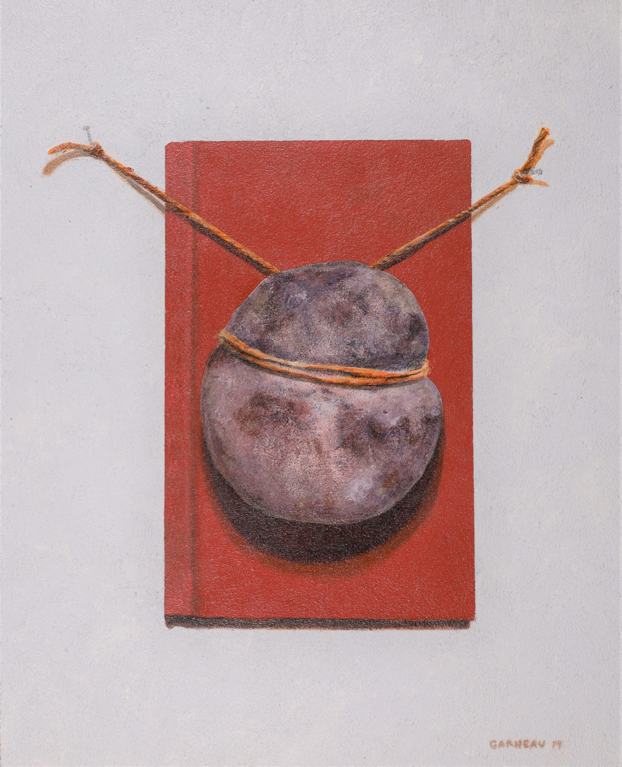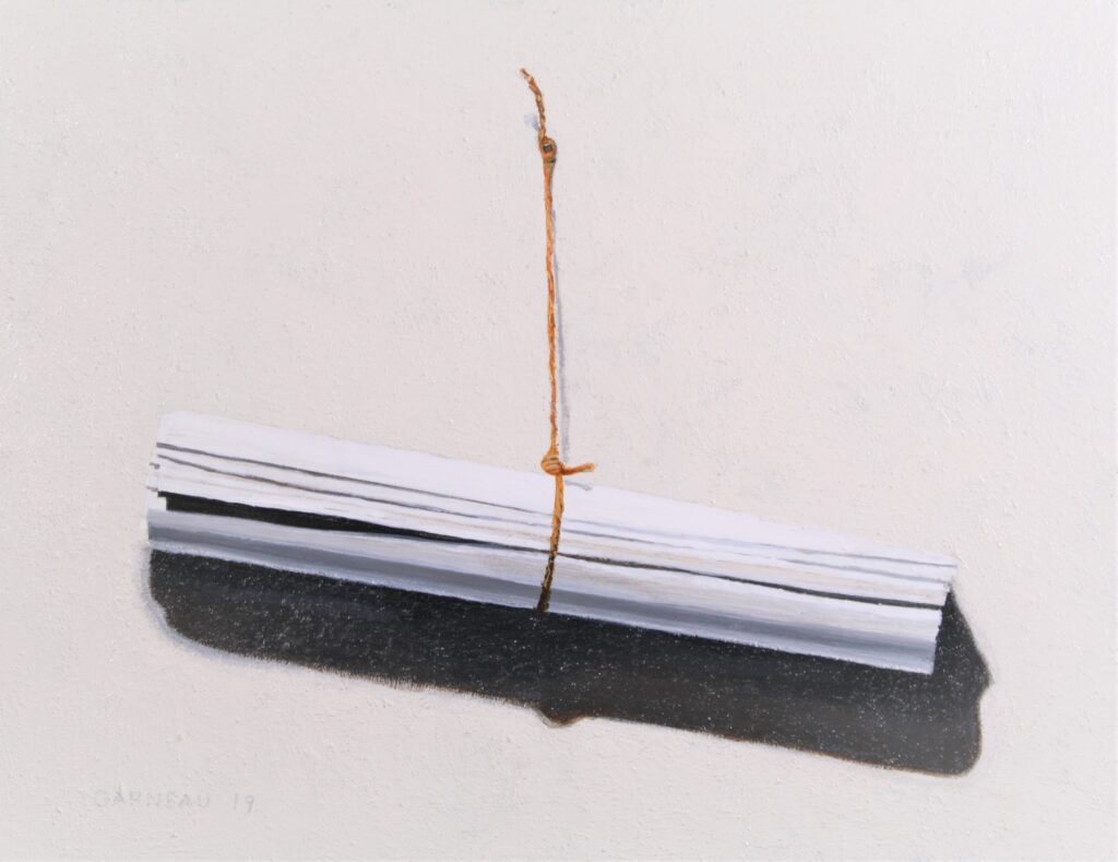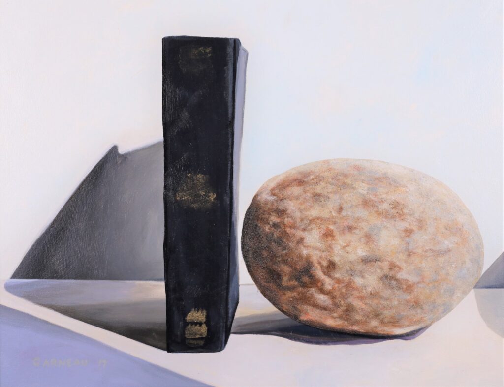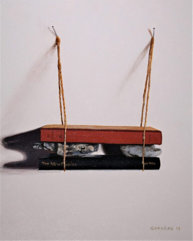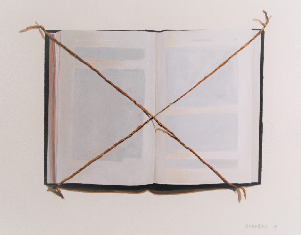 “Displacement: Indigenous on Indigenous Scholarship” and “Metis in the Academy” belong to a series of still life paintings I have been making since the winter of 2019. Through the genre of still life paintings, the series describes the complexity of being a contemporary Indigenous person, academic, and artist. Many of the paintings feature books, rocks, and twine arranged to represent these joys and struggles. Indigenous knowledge keepers often feel conflicted about the need to share their knowledge and a concern that turning it into English and a text might not do the knowledge justice, and that books might displace them. “Empathetic Conformation” (2019), for example shows a black book (book learning) and a rock (grandfather/Indigenous knowledge) on a table. The book leans toward the rock, perhaps altered by their proximity. “Indigenous Research Methodology (I)” (2019), shows a rock on a book, suggesting that Indigenous knowledge is more than what can be contained in a book, or that Indigenous is a combination of teachings from a specific earth site and from books.