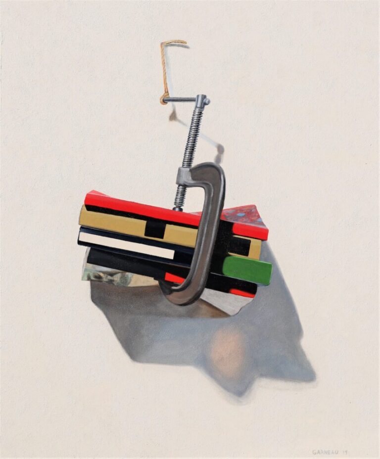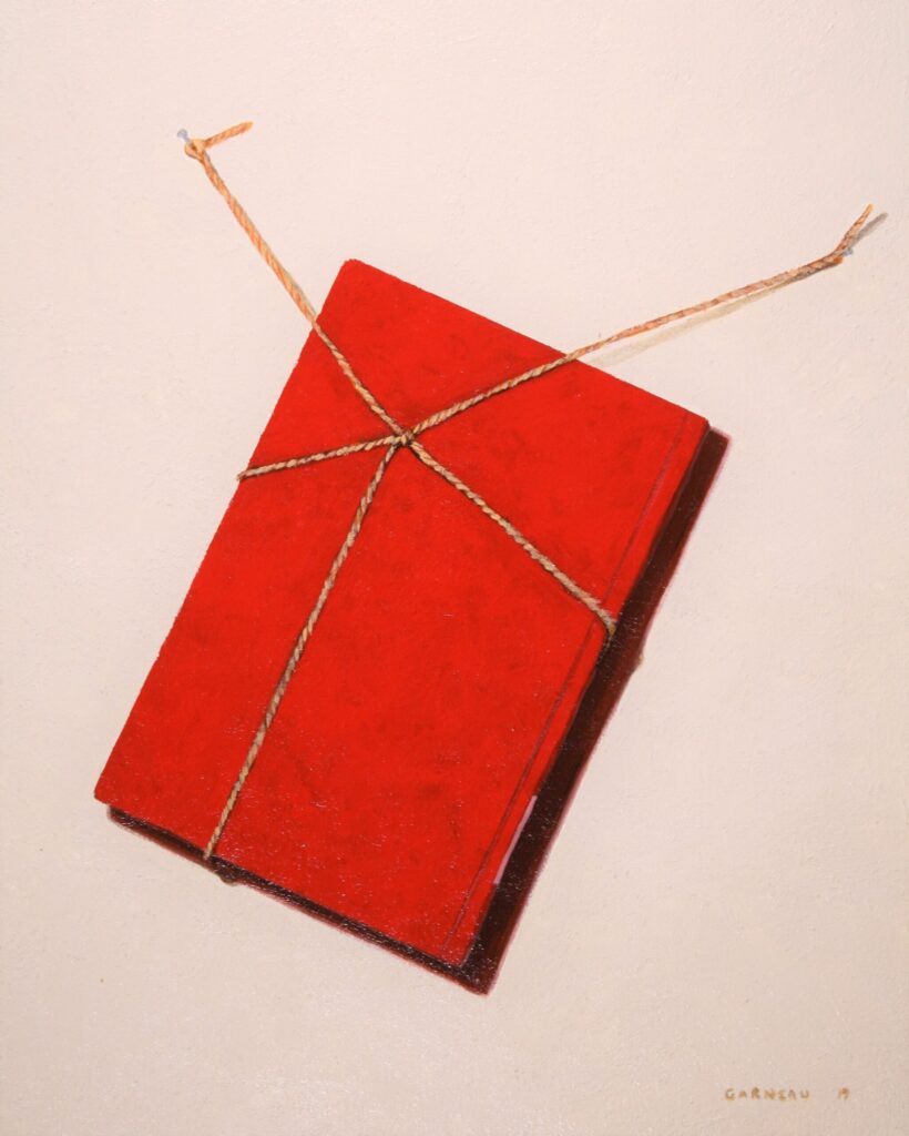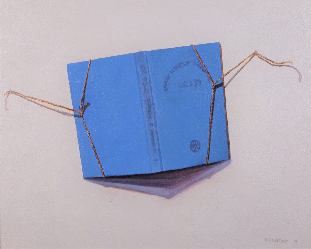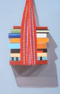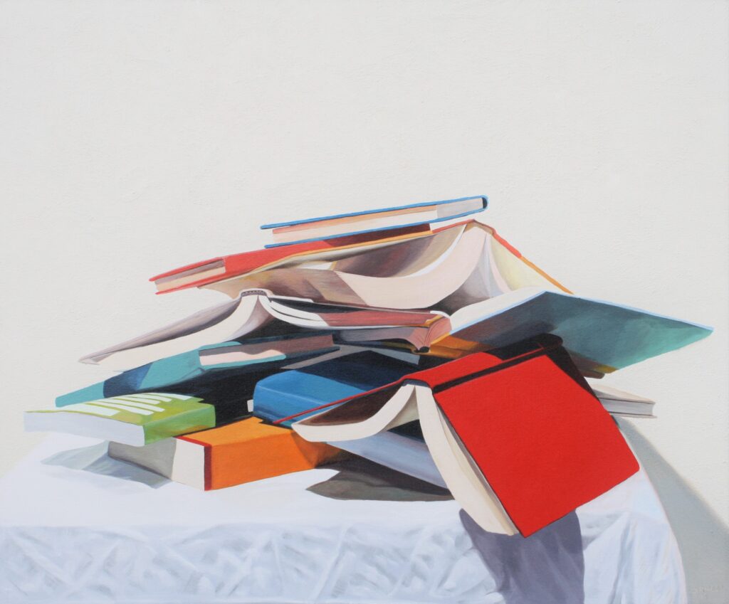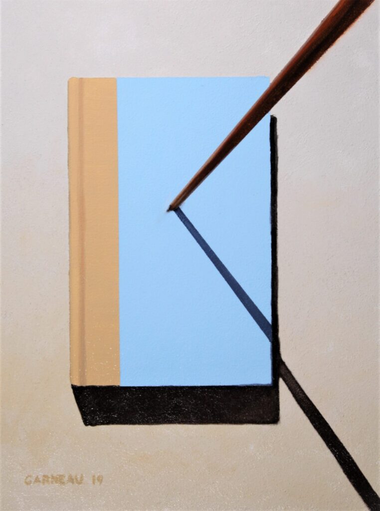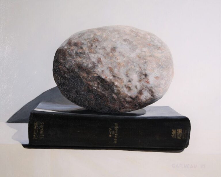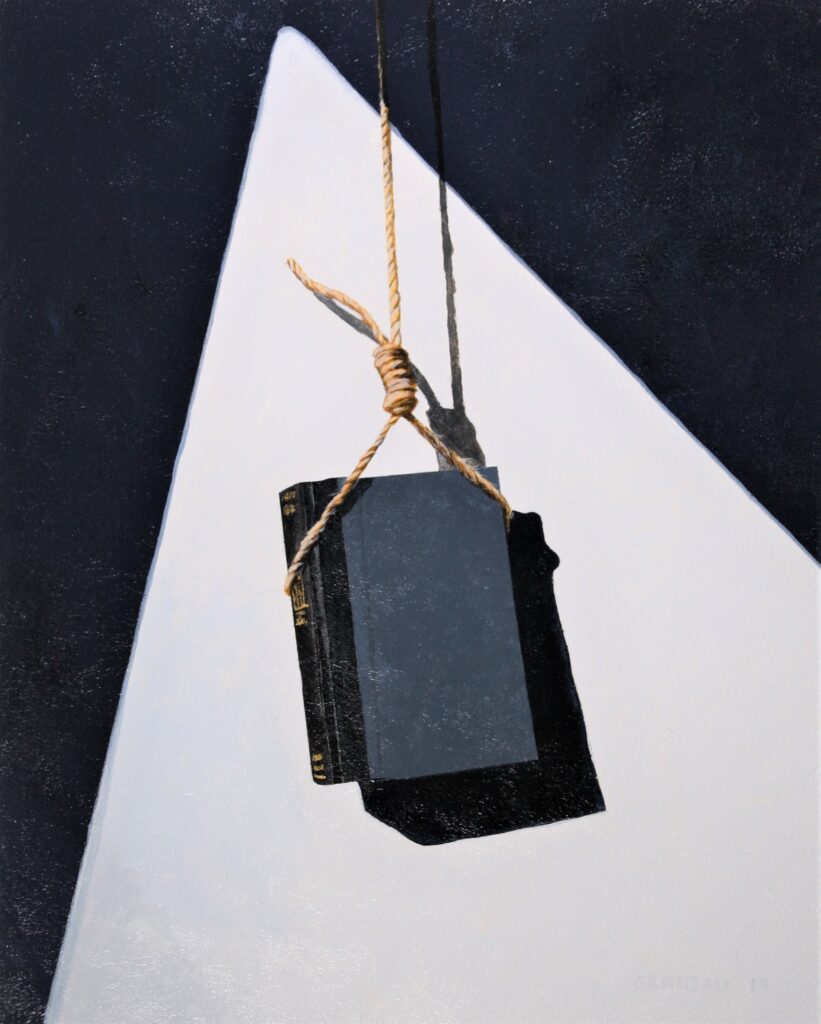 “Displacement: Indigenous on Indigenous Scholarship” and “Metis in the Academy” belong to a series of still life paintings I have been making since the winter of 2019. Through the genre of still life paintings, the series describes the complexity of being a contemporary Indigenous person, academic, and artist. Many of the paintings feature books, rocks, and twine arranged to represent these joys and struggles. Indigenous knowledge keepers often feel conflicted about the need to share their knowledge and a concern that turning it into English and a text might not do the knowledge justice, and that books might displace them. “Empathetic Conformation” (2019), for example shows a black book (book learning) and a rock (grandfather/Indigenous knowledge) on a table. The book leans toward the rock, perhaps altered by their proximity. “Indigenous Research Methodology (I)” (2019), shows a rock on a book, suggesting that Indigenous knowledge is more than what can be contained in a book, or that Indigenous is a combination of teachings from a specific earth site and from books.