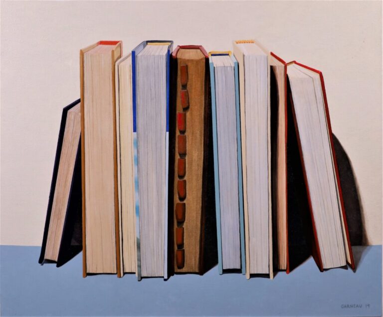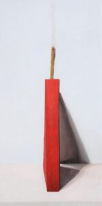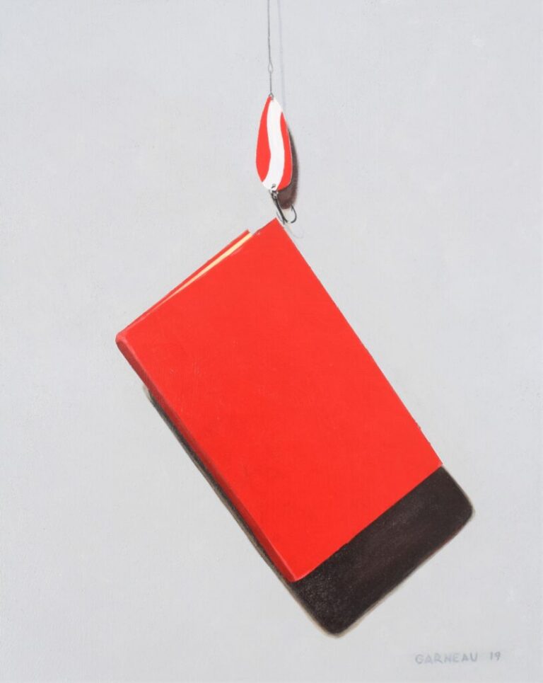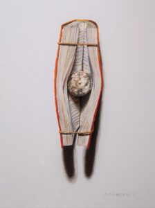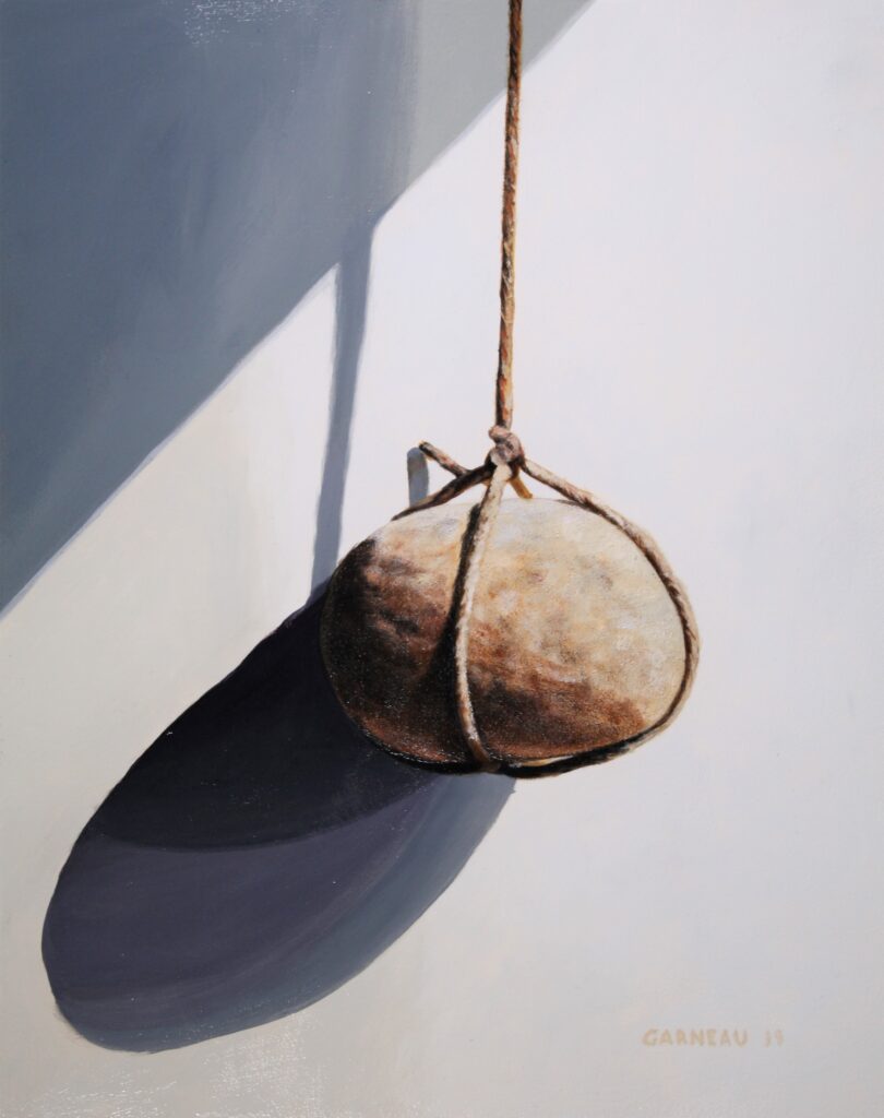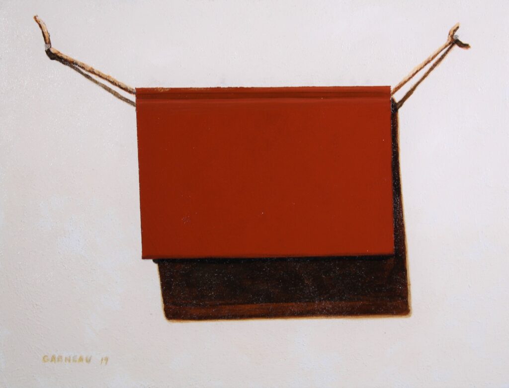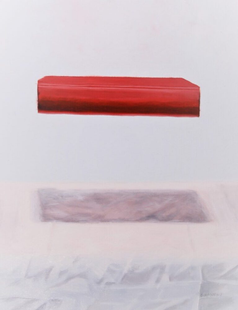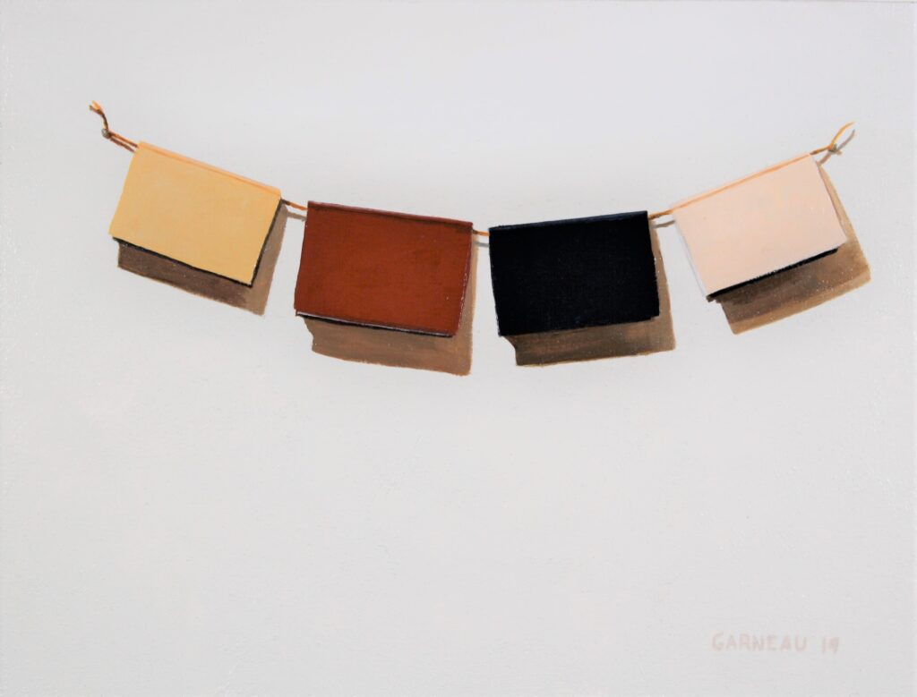 “Displacement: Indigenous on Indigenous Scholarship” and “Metis in the Academy” belong to a series of still life paintings I have been making since the winter of 2019. Through the genre of still life paintings, the series describes the complexity of being a contemporary Indigenous person, academic, and artist. Many of the paintings feature books, rocks, and twine arranged to represent these joys and struggles. Indigenous knowledge keepers often feel conflicted about the need to share their knowledge and a concern that turning it into English and a text might not do the knowledge justice, and that books might displace them. “Empathetic Conformation” (2019), for example shows a black book (book learning) and a rock (grandfather/Indigenous knowledge) on a table. The book leans toward the rock, perhaps altered by their proximity. “Indigenous Research Methodology (I)” (2019), shows a rock on a book, suggesting that Indigenous knowledge is more than what can be contained in a book, or that Indigenous is a combination of teachings from a specific earth site and from books.
