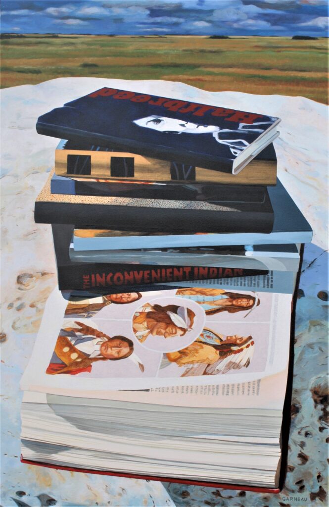 This still life consists of a stack of books on a rock. The rock is beside First Nations University. The books are First Nations and Métis authored literature and research stacked on an old, settler authored picture book about the “Vanishing Indian.” The suggestion is that land-based knowledge grounds Indigenous ways of knowing and being, but that books authored by Indigenous folks are also required if we are to provide truer representations of Indigenous people and knowledge. The choices of books—theory, biography, and literature—show the growing richness of Indigenous writing.