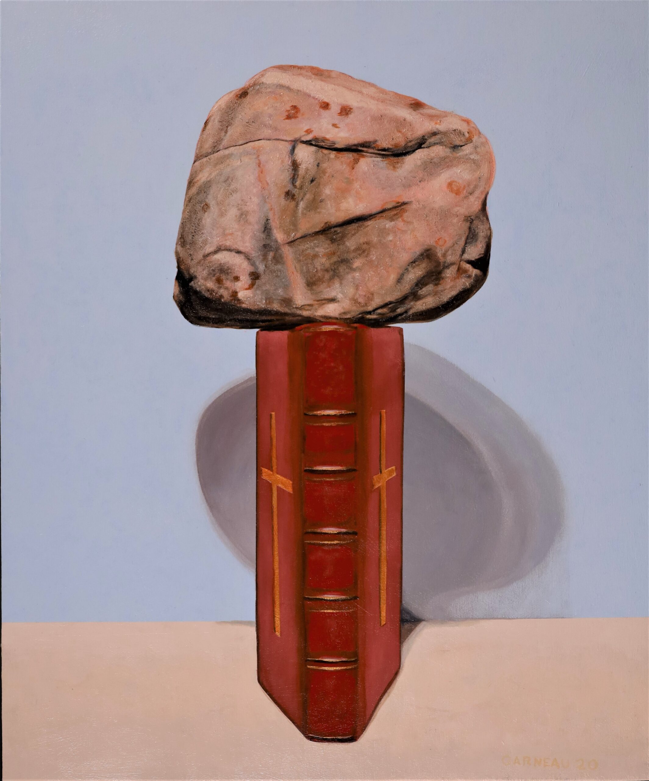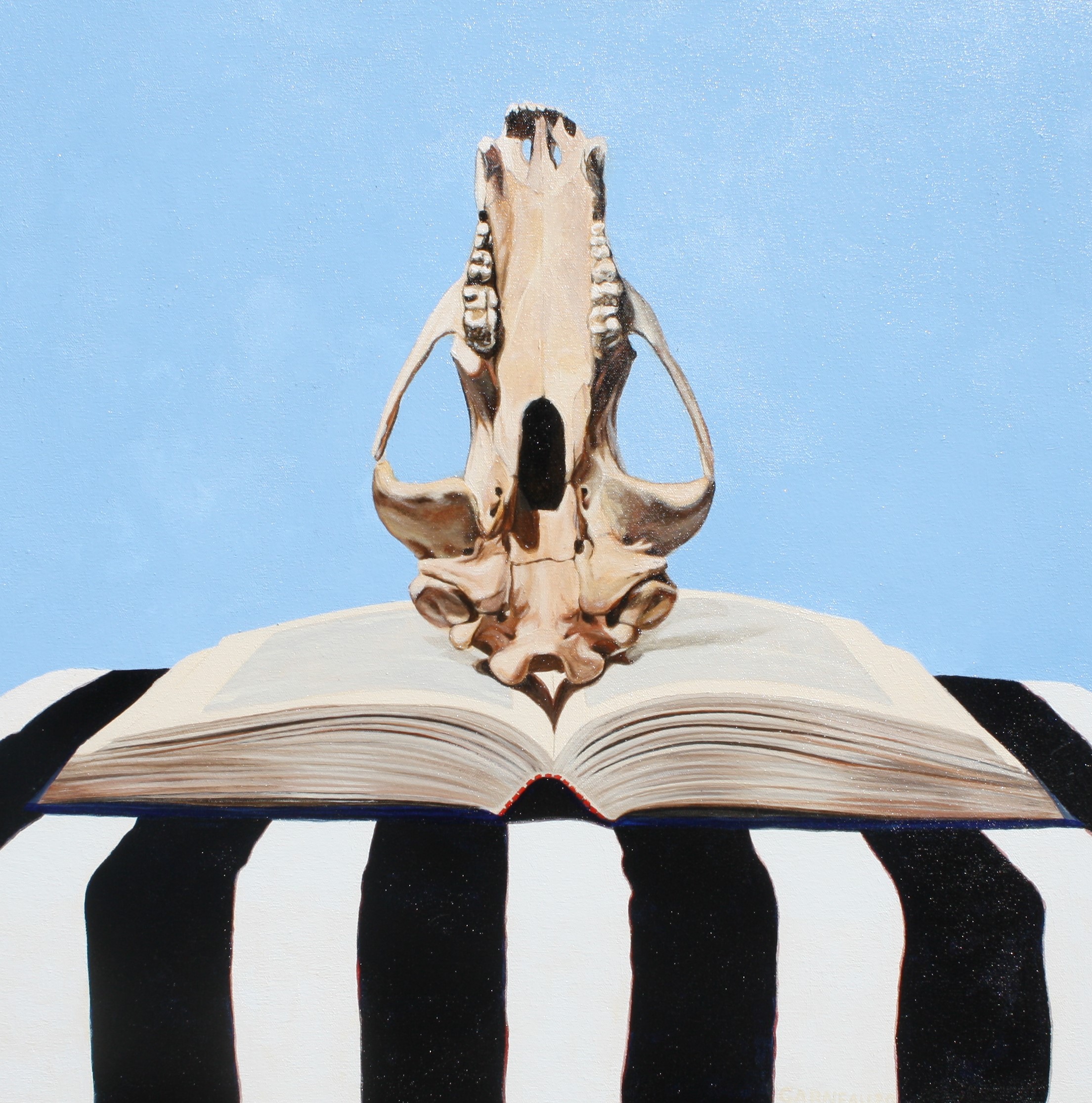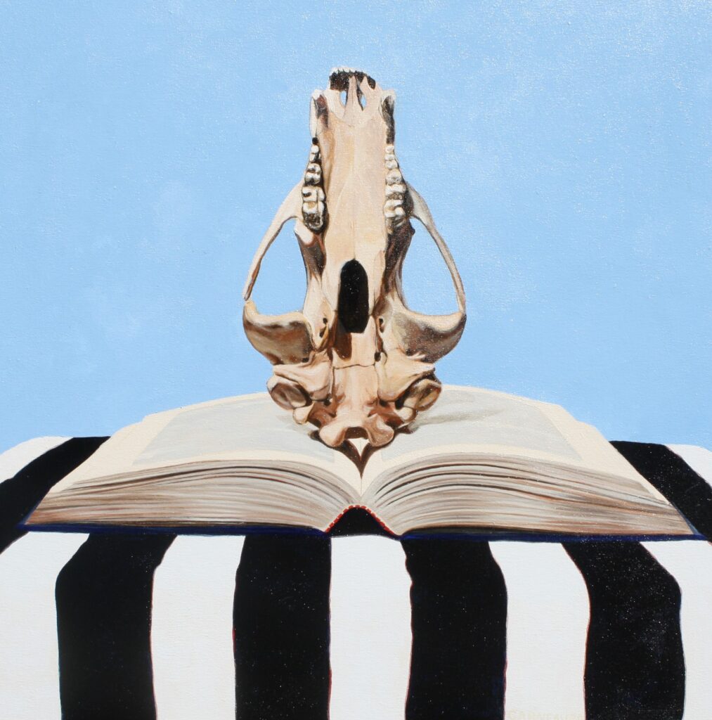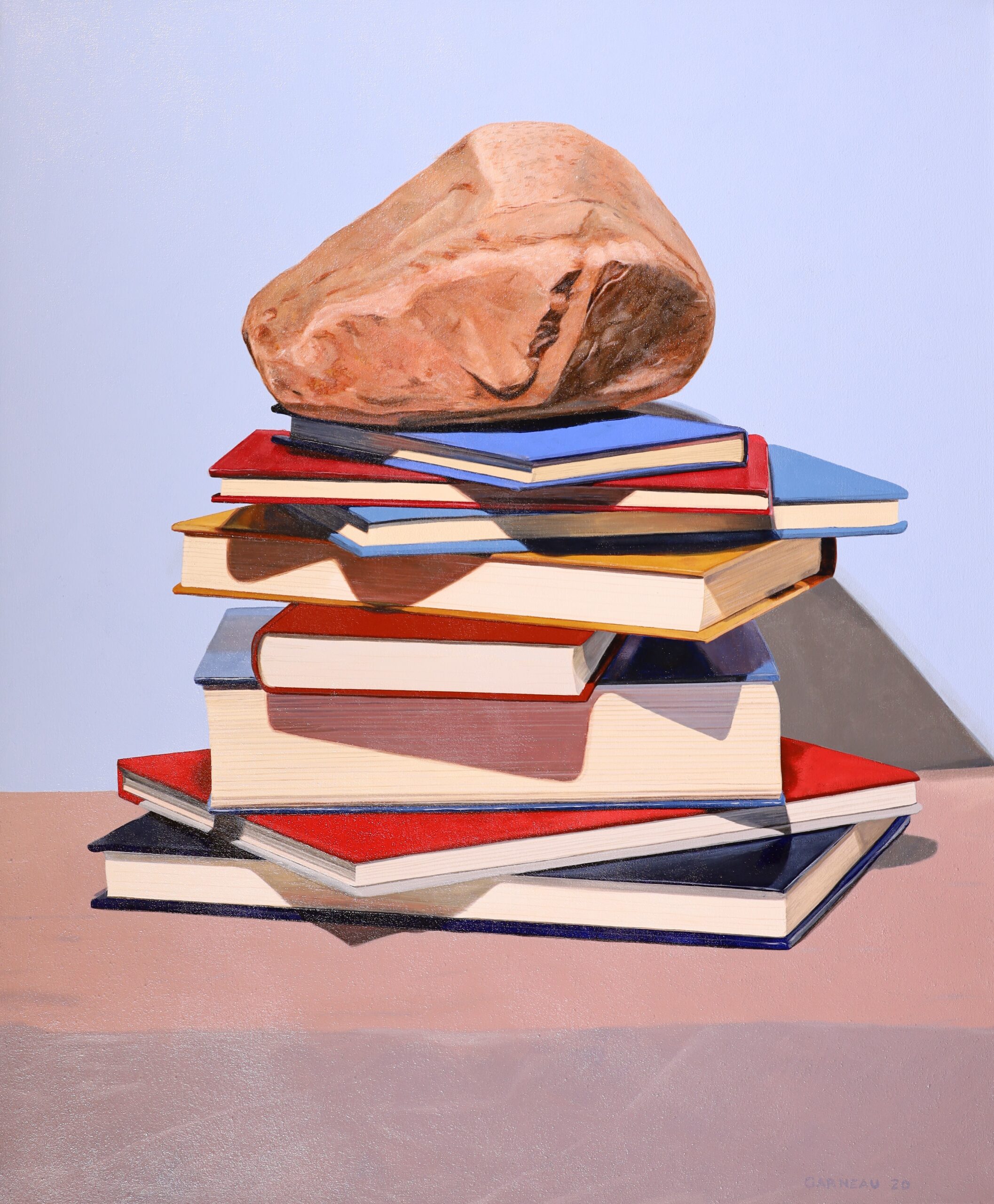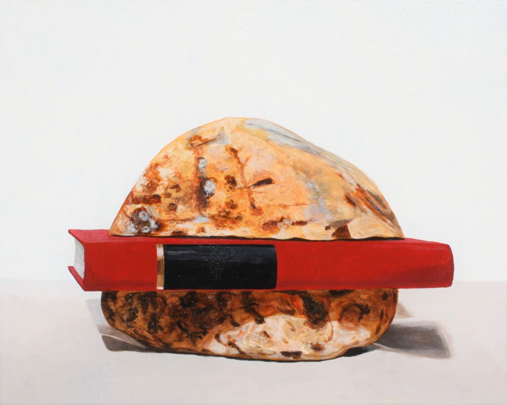 European Art Academies positioned still life painting at the bottom of their hierarchy. Being the depiction of the things of everyday life, still life was considered a poor container for the lofty concepts found in history, portraiture, and even landscape painting. Dark Chapters challenges this assumption and status. These realistic paintings consist of things that are ready to hand: rocks, stones, bricks, books, flowers, water, hammers, mirrors, fabric, flags, honey, fish, teacups, jars, boxes, string, rope, and chains. And some less homey items: skulls, bones, smoke, ancient stone tools, sashes, bees, flies, rotting fruit, and hand cuffs. The objects are arranged to suggest meanings beyond representation. Books, for example, stand for book knowledge, universities, and professors. Rocks represent Indigenous ways of knowing, being, and doing, and, sometimes, Indigenous persons. Some rocks are stones or Grandfathers.