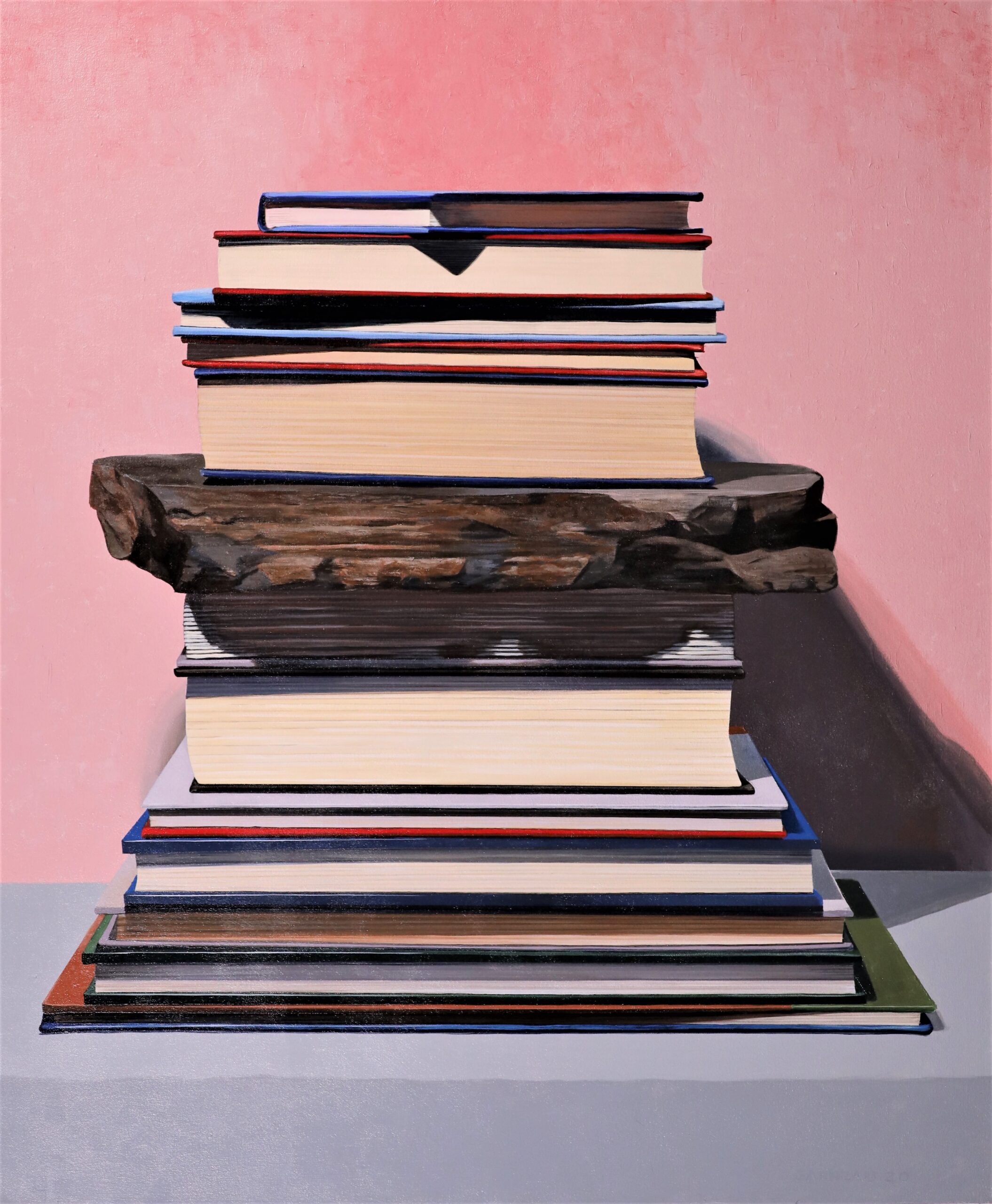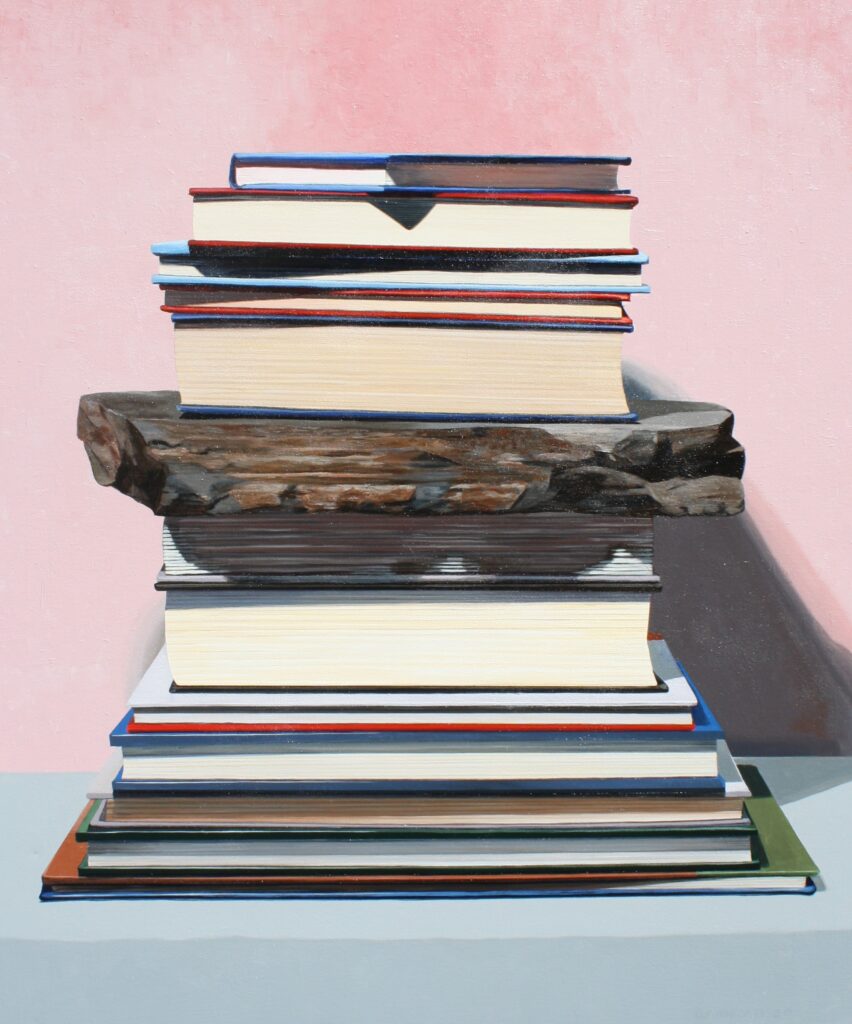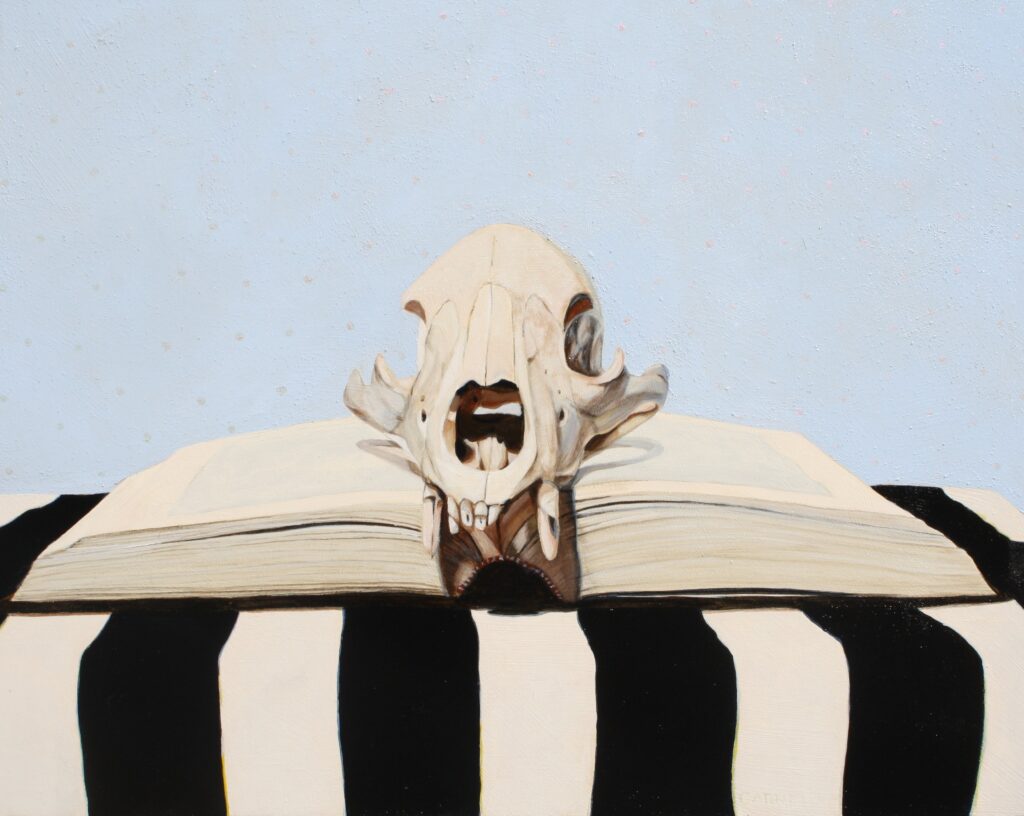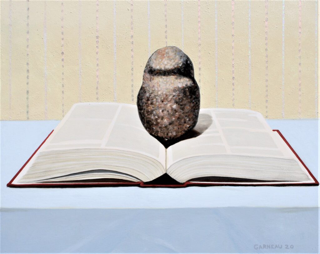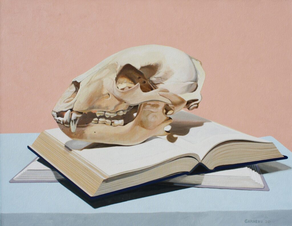 European Art Academies positioned still life painting at the bottom of their hierarchy. Being the depiction of the things of everyday life, still life was considered a poor container for the lofty concepts found in history, portraiture, and even landscape painting. Dark Chapters challenges this assumption and status. These realistic paintings consist of things that are ready to hand: rocks, stones, bricks, books, flowers, water, hammers, mirrors, fabric, flags, honey, fish, teacups, jars, boxes, string, rope, and chains. And some less homey items: skulls, bones, smoke, ancient stone tools, sashes, bees, flies, rotting fruit, and hand cuffs. The objects are arranged to suggest meanings beyond representation. Books, for example, stand for book knowledge, universities, and professors. Rocks represent Indigenous ways of knowing, being, and doing, and, sometimes, Indigenous persons. Some rocks are stones or Grandfathers.