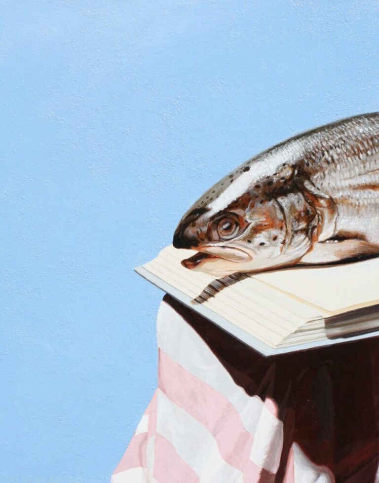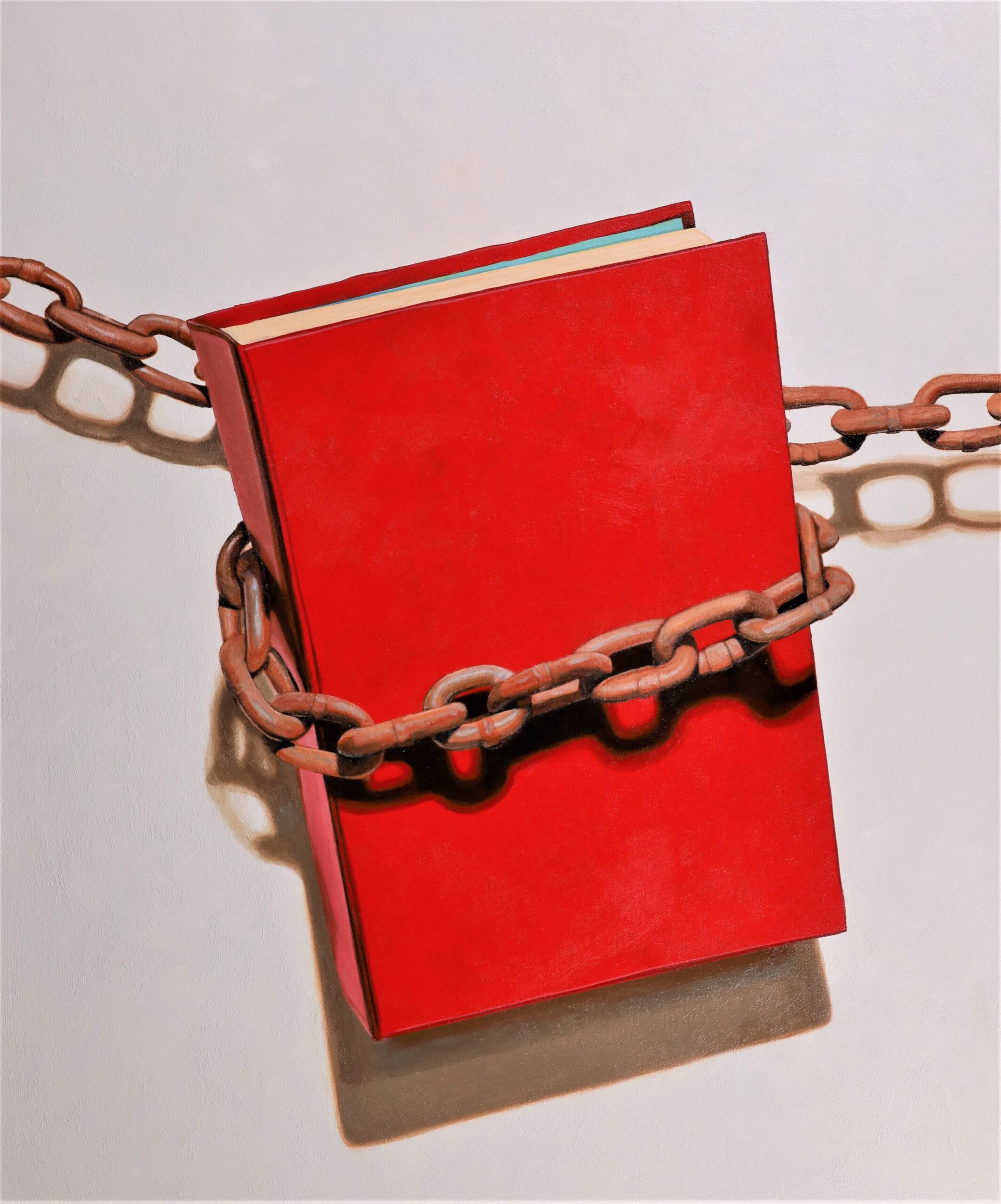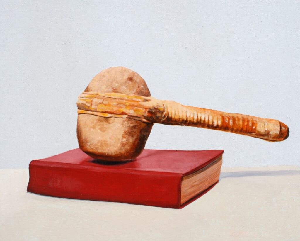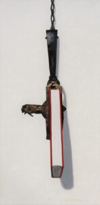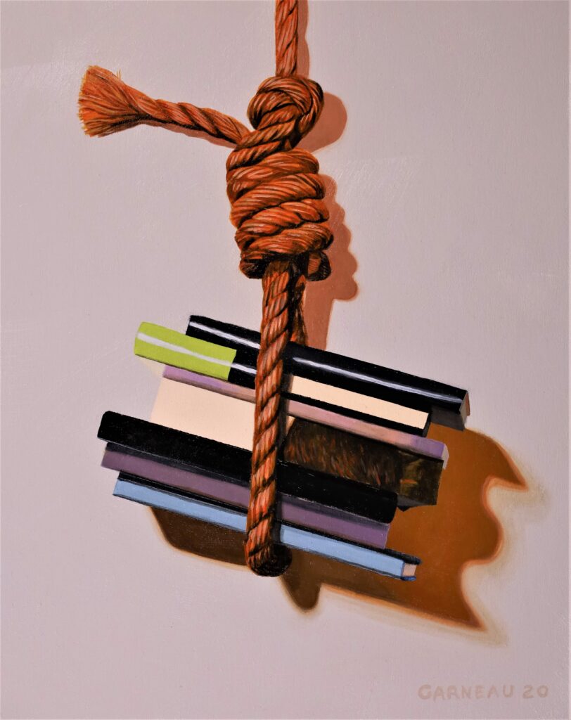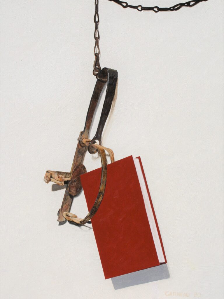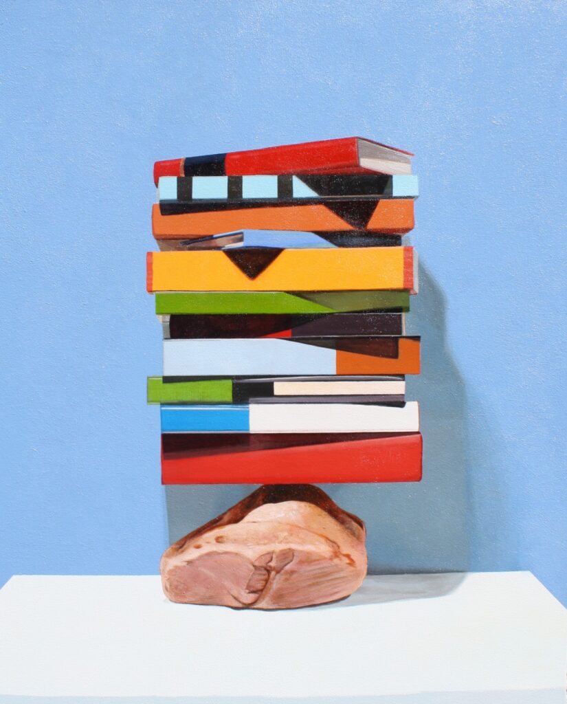 European Art Academies positioned still life painting at the bottom of their hierarchy. Being the depiction of the things of everyday life, still life was considered a poor container for the lofty concepts found in history, portraiture, and even landscape painting. Dark Chapters challenges this assumption and status. These realistic paintings consist of things that are ready to hand: rocks, stones, bricks, books, flowers, water, hammers, mirrors, fabric, flags, honey, fish, teacups, jars, boxes, string, rope, and chains. And some less homey items: skulls, bones, smoke, ancient stone tools, sashes, bees, flies, rotting fruit, and hand cuffs. The objects are arranged to suggest meanings beyond representation. Books, for example, stand for book knowledge, universities, and professors. Rocks represent Indigenous ways of knowing, being, and doing, and, sometimes, Indigenous persons. Some rocks are stones or Grandfathers.