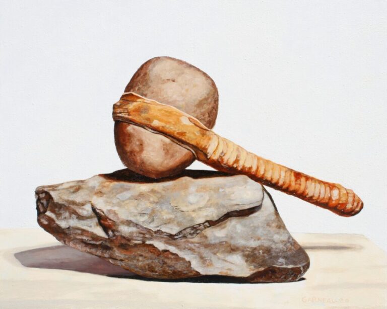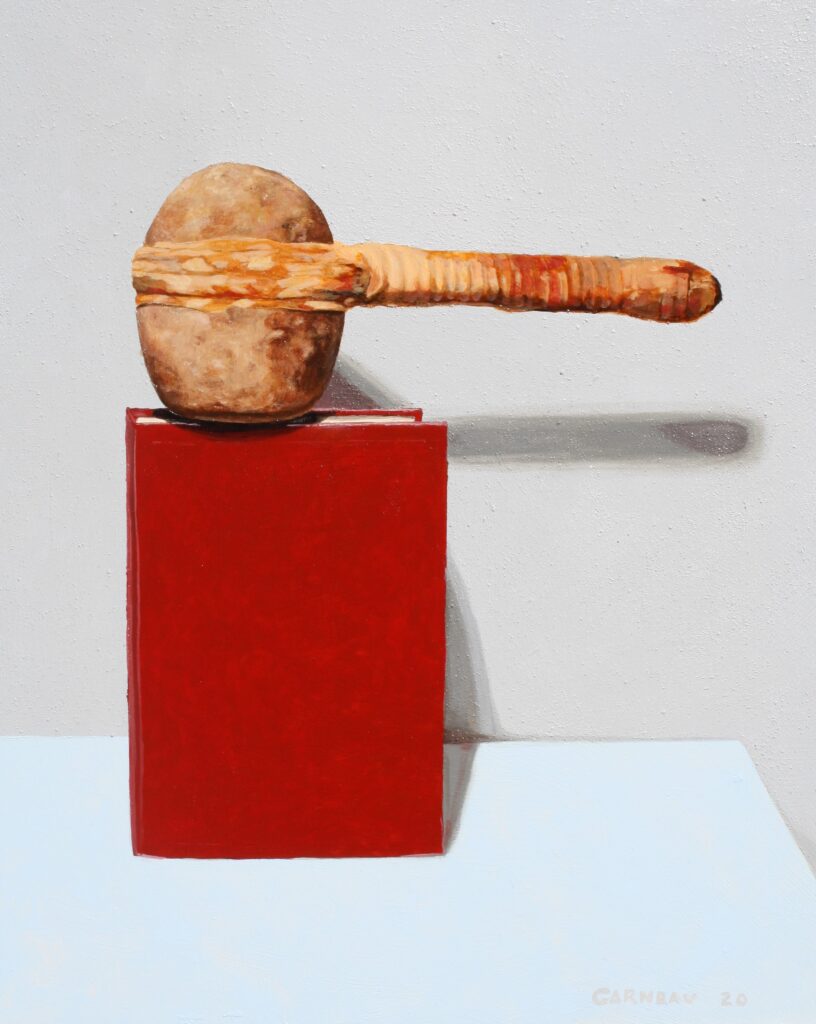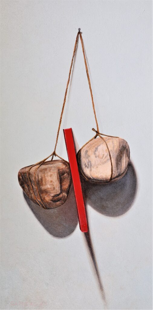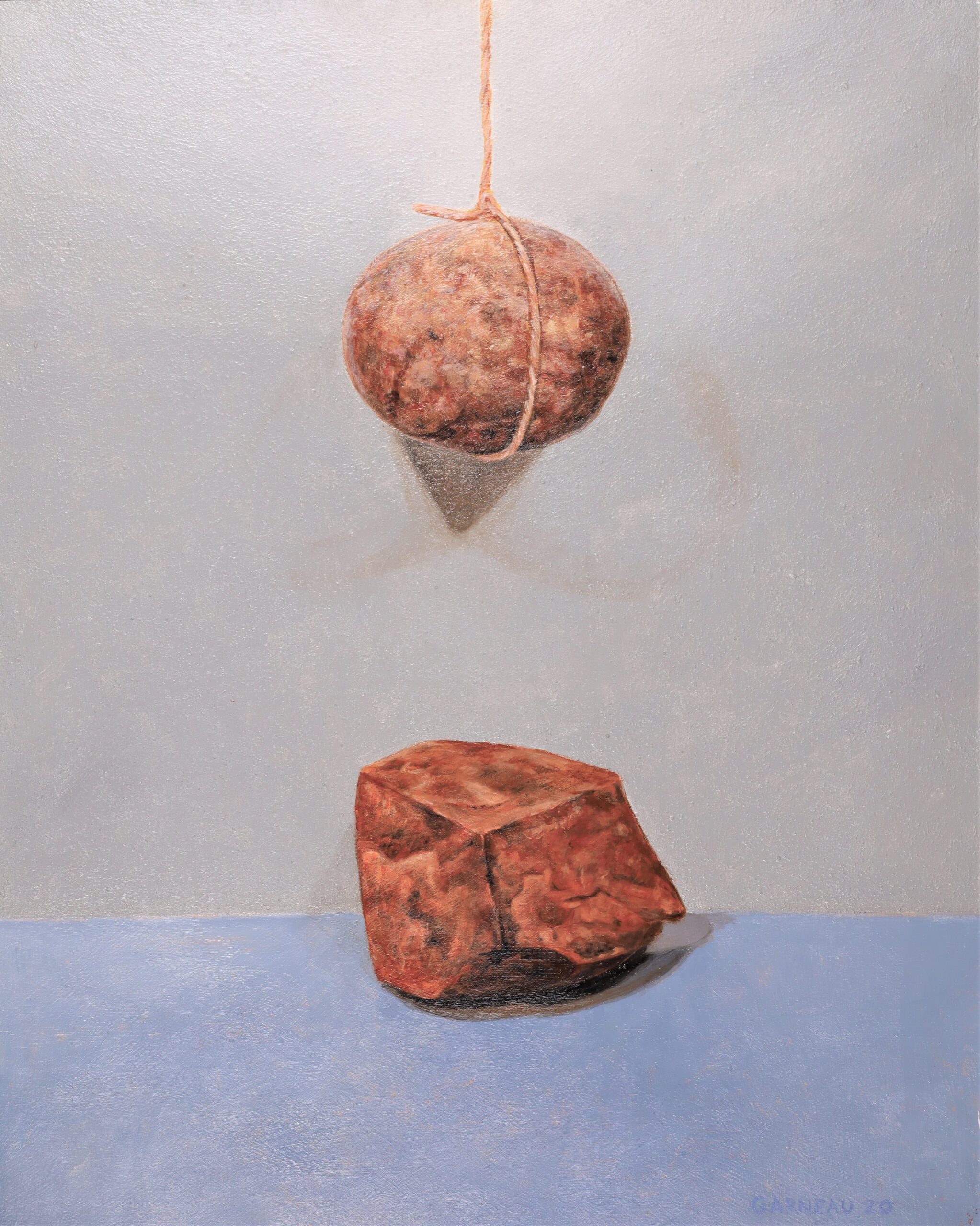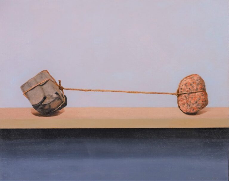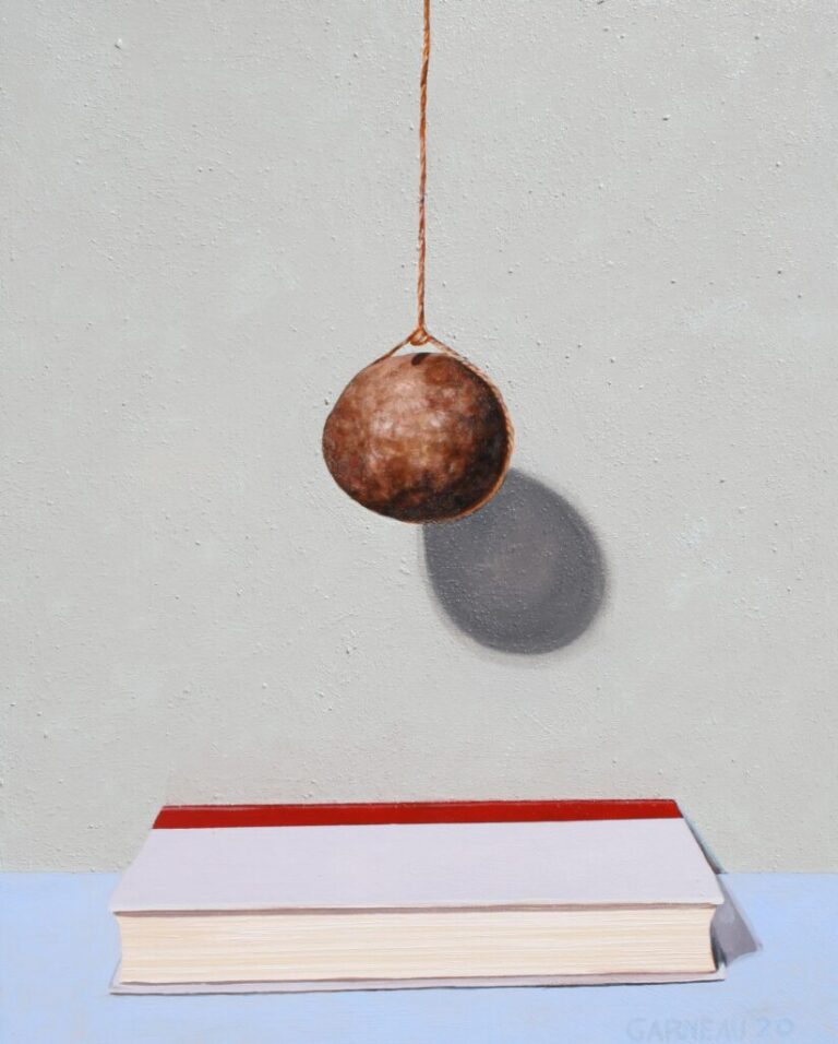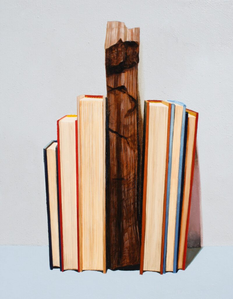 Before painting, I compose. In dreams, in notebooks, but especially with my subjects. Three times a year, I take a week to commune with my non-mental subjects. I observe them, hold them. What do they want? Who do they want to be nearby? What might they mean to and with each other? Today, a round stone the size of a child’s cranium wants to be cradled in bubble wrap. Tomorrow, it asks to be bound in twine. Next day, “leave me alone, unpictured.” Admittedly, sometimes, my subjects become objects and are made to do things I rather than they intend. I still feel bad about drowning that dictionary. Antique teacups and jugs are smashed with a stone hammer for a point I want to make. Sealing smudge smoke in a bell jar needed doing—but maybe not. No book wants burning but, one day, one may.