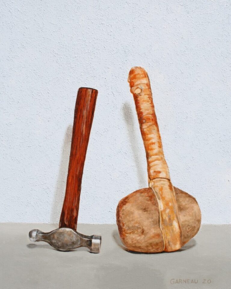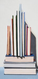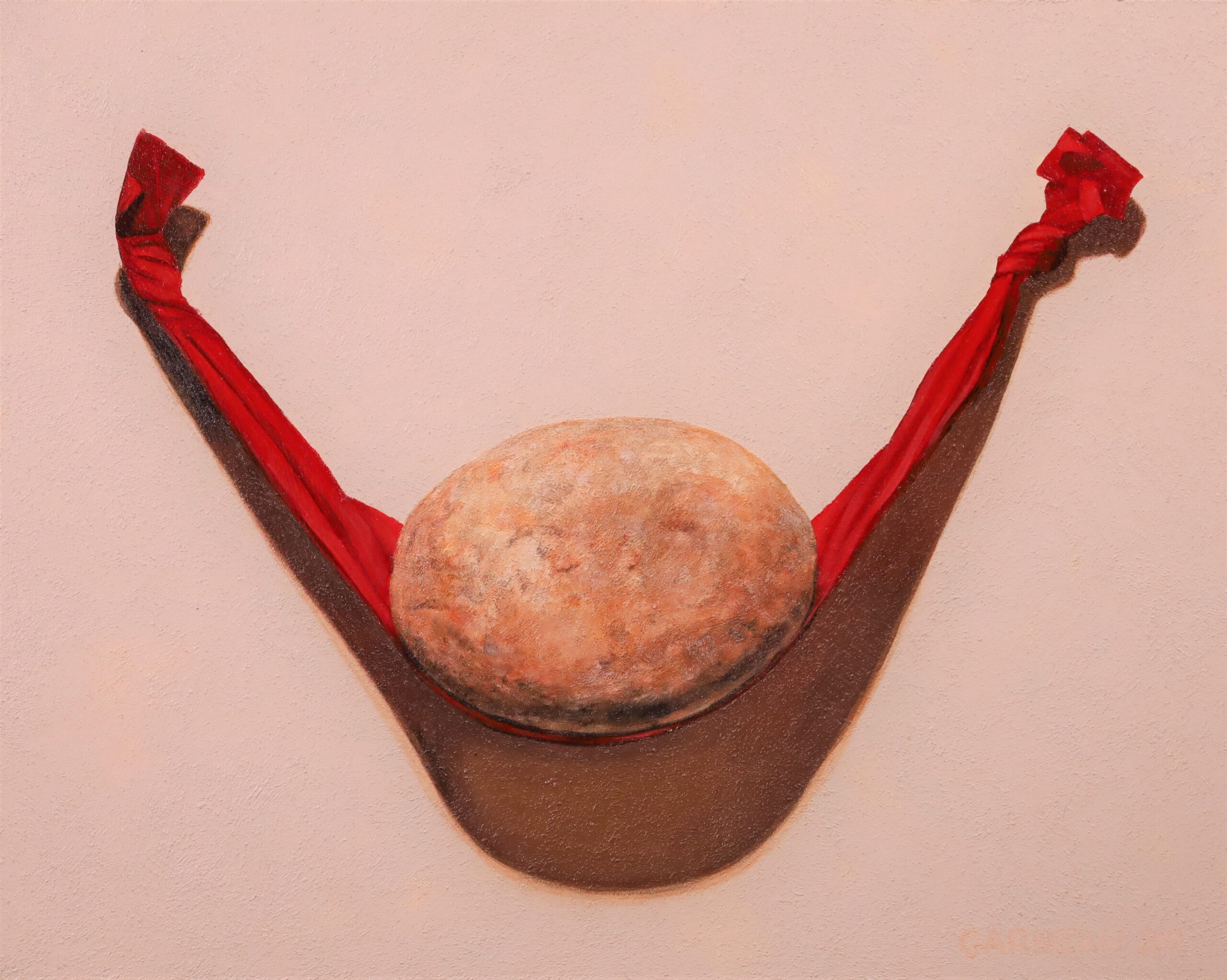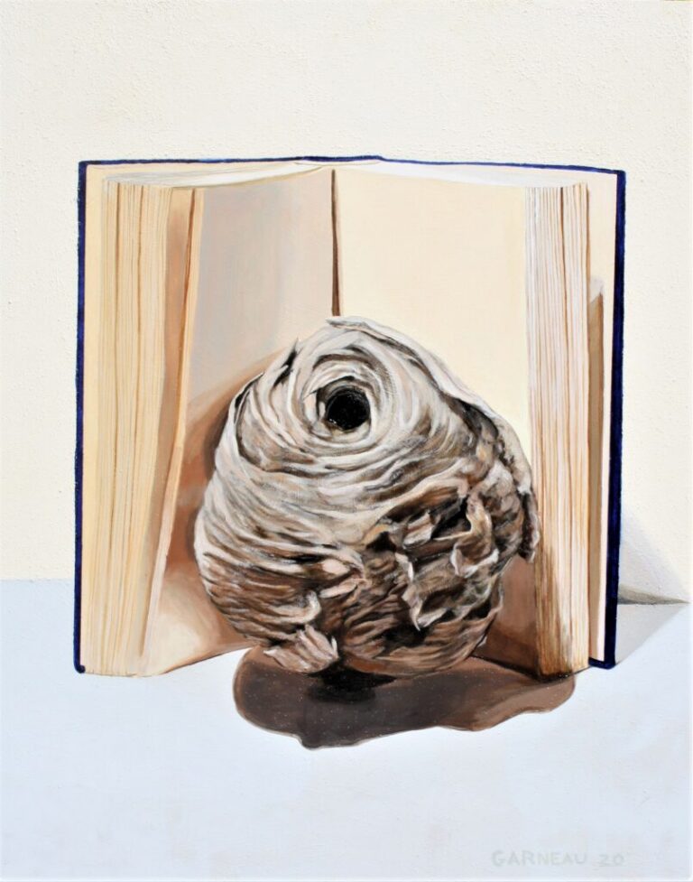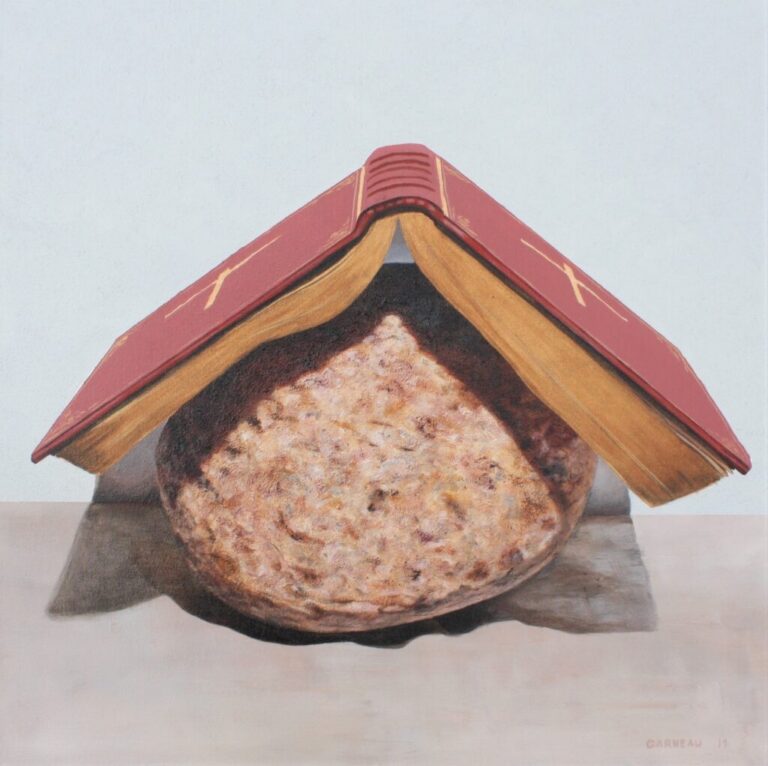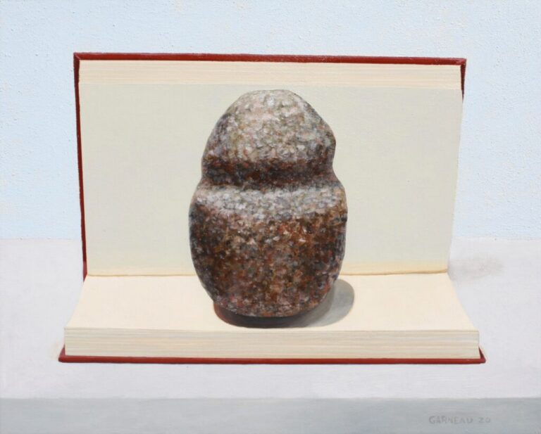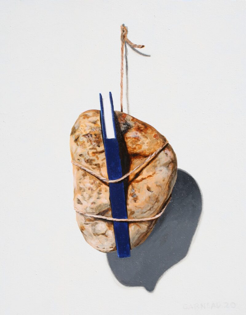Before painting, I compose. In dreams, in notebooks, but especially with my subjects. Three times a year, I take a week to commune with my non-mental subjects. I observe them, hold them. What do they want? Who do they want to be nearby? What might they mean to and with each other? Today, a round stone the size of a child’s cranium wants to be cradled in bubble wrap. Tomorrow, it asks to be bound in twine. Next day, “leave me alone, unpictured.” Admittedly, sometimes, my subjects become objects and are made to do things I rather than they intend. I still feel bad about drowning that dictionary. Antique teacups and jugs are smashed with a stone hammer for a point I want to make. Sealing smudge smoke in a bell jar needed doing—but maybe not. No book wants burning but, one day, one may.