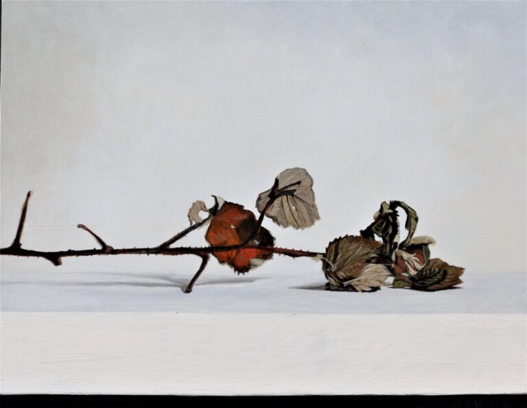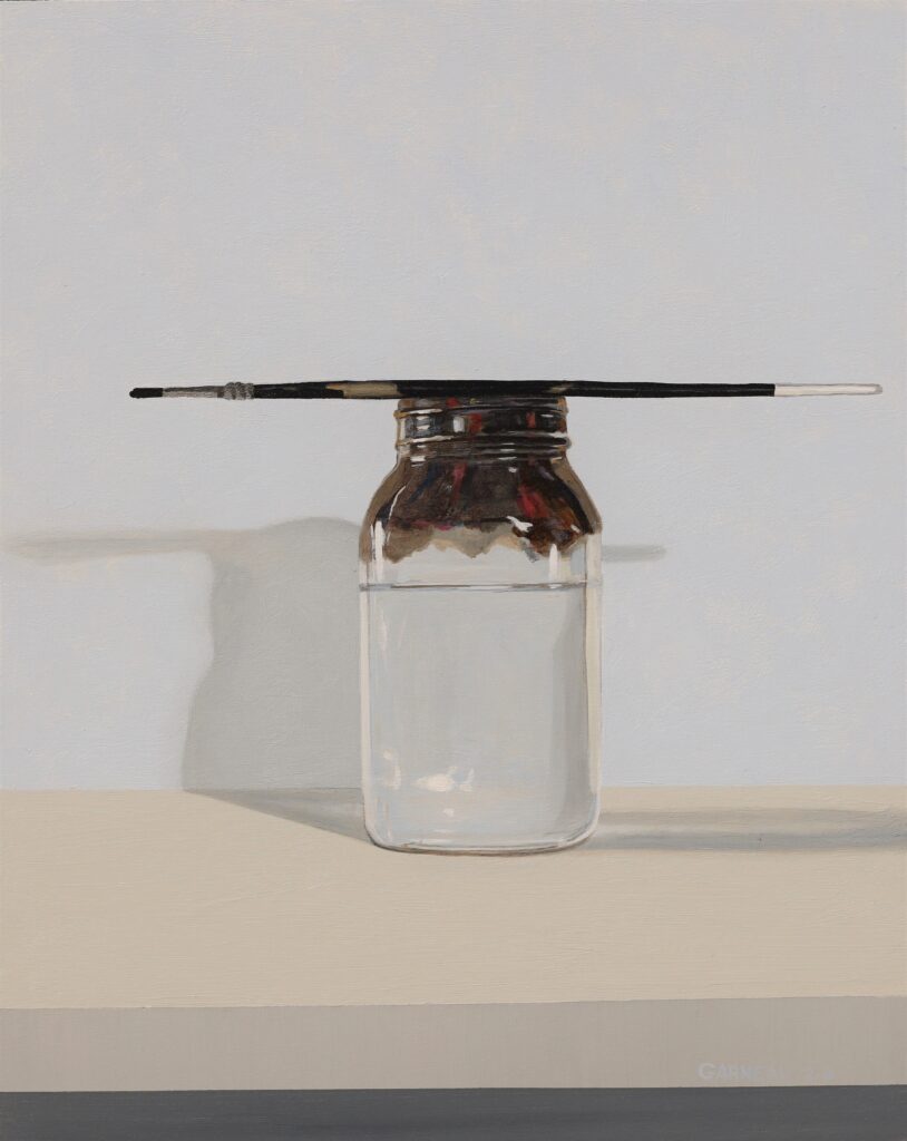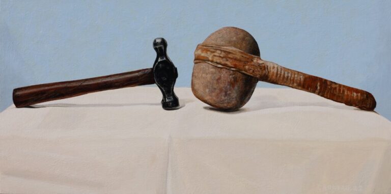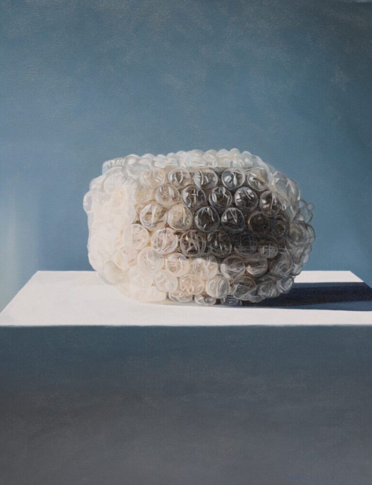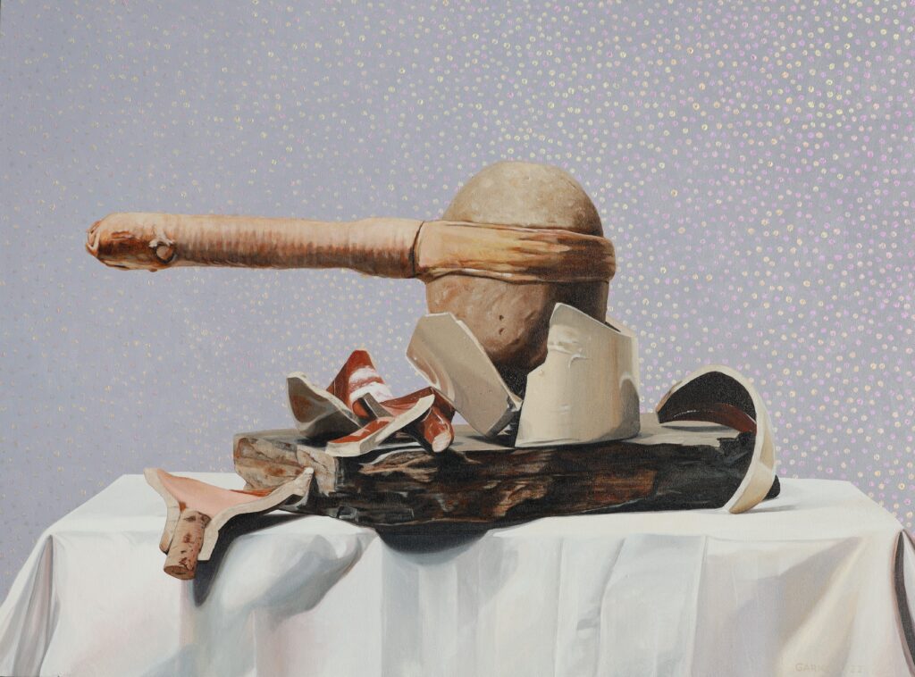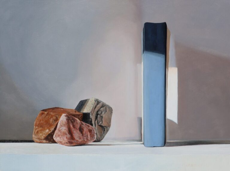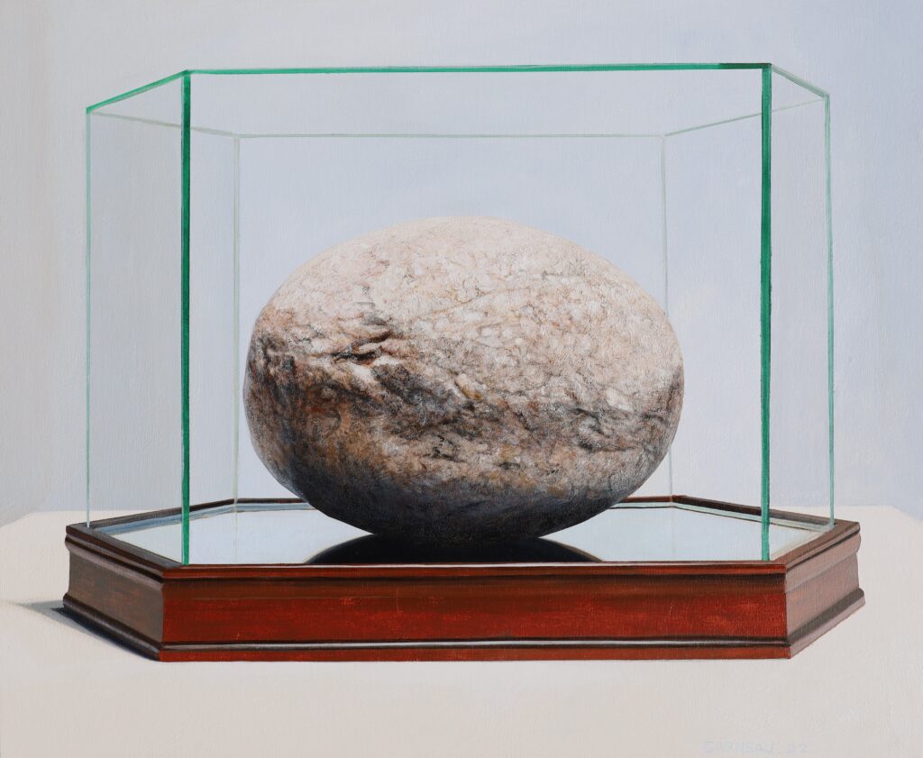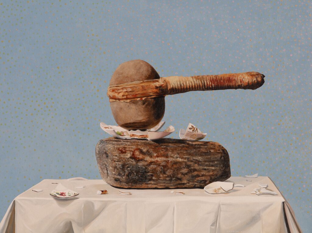 Before painting, I compose. In dreams, in notebooks, but especially with my subjects. Three times a year, I take a week to commune with my non-mental subjects. I observe them, hold them. What do they want? Who do they want to be nearby? What might they mean to and with each other? Today, a round stone the size of a child’s cranium wants to be cradled in bubble wrap. Tomorrow, it asks to be bound in twine. Next day, “leave me alone, unpictured.” Admittedly, sometimes, my subjects become objects and are made to do things I rather than they intend. I still feel bad about drowning that dictionary. Antique teacups and jugs are smashed with a stone hammer for a point I want to make. Sealing smudge smoke in a bell jar needed doing—but maybe not. No book wants burning but, one day, one may.