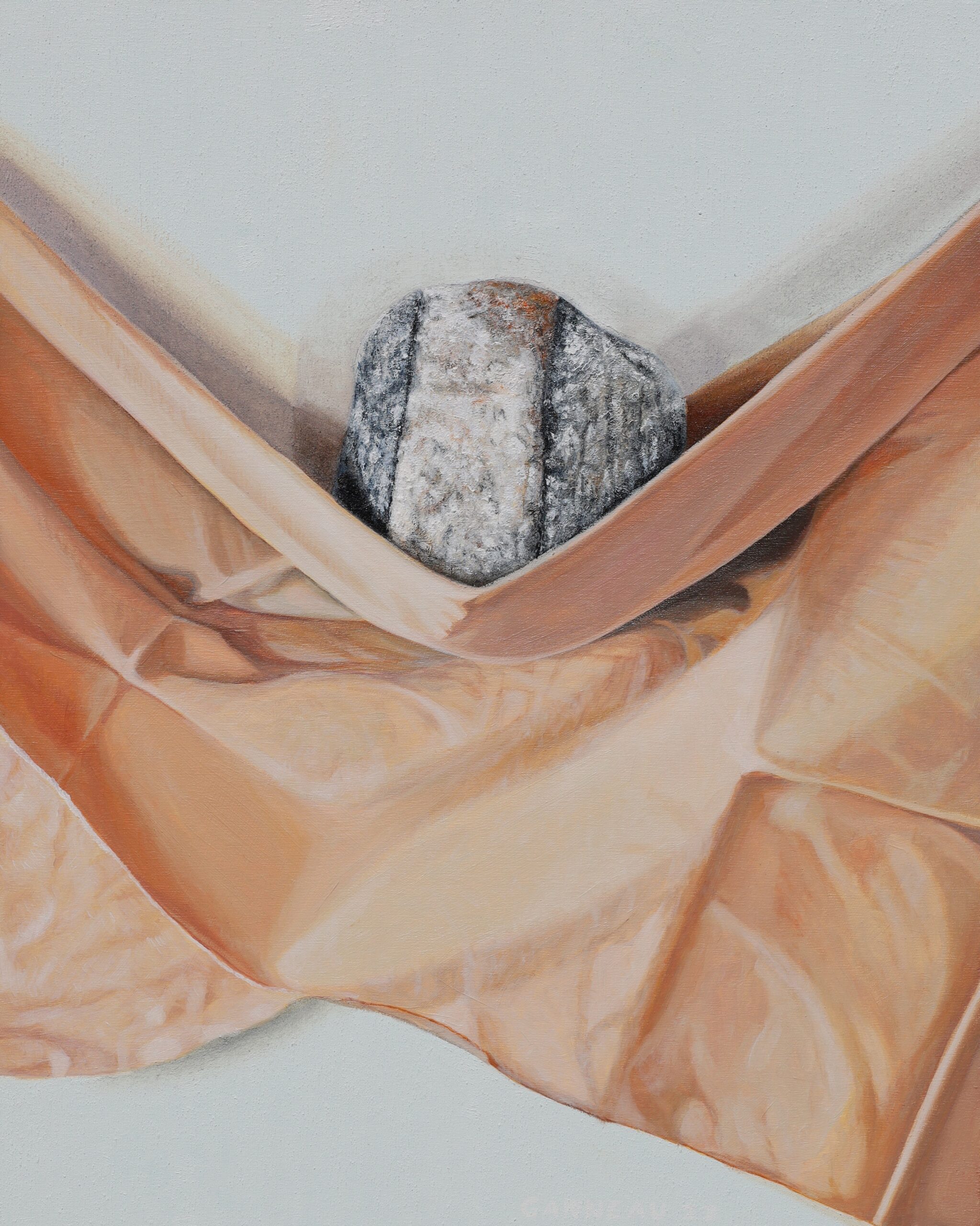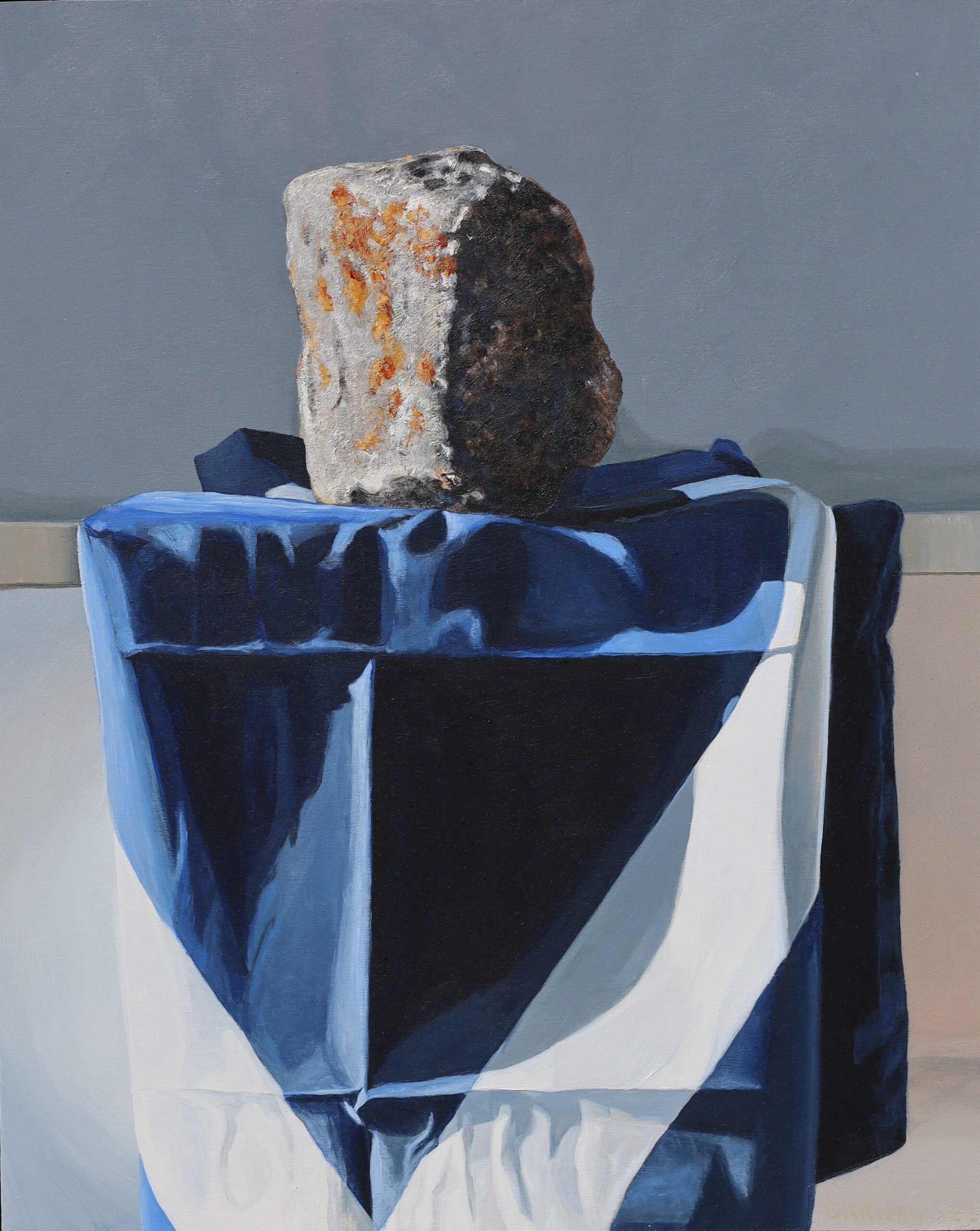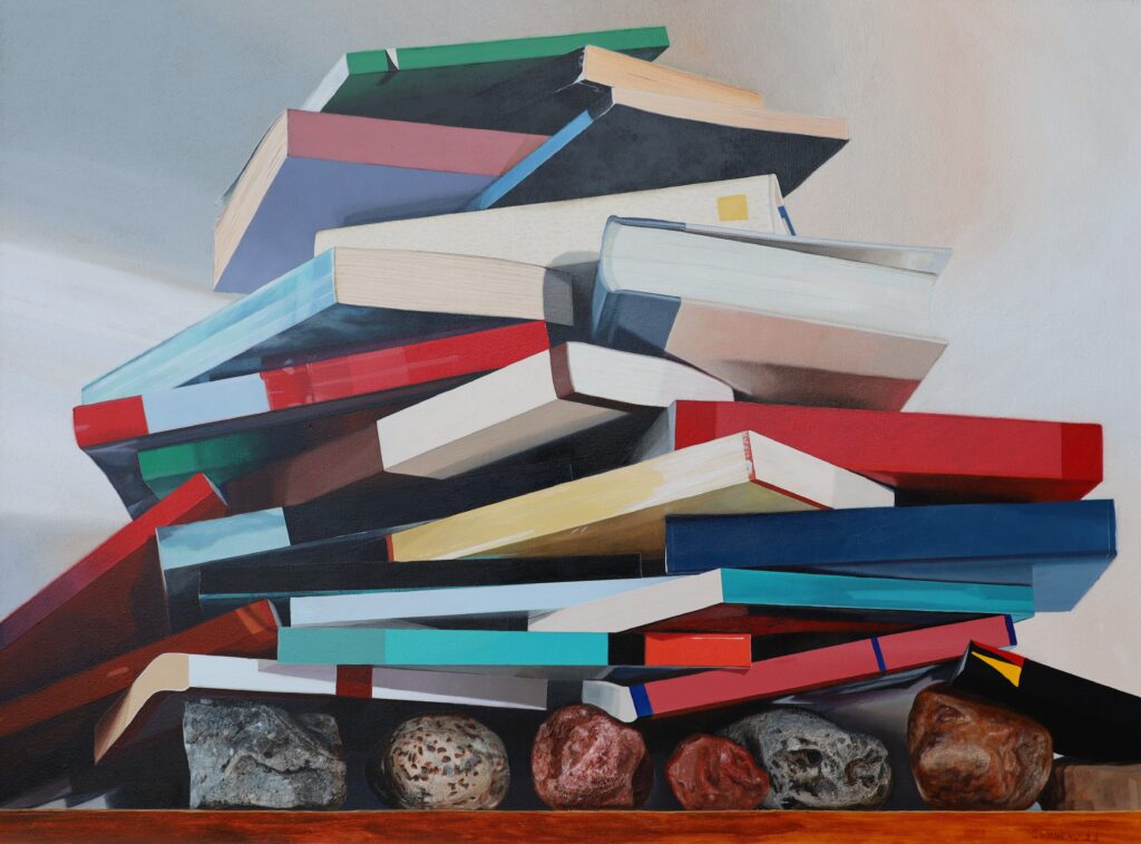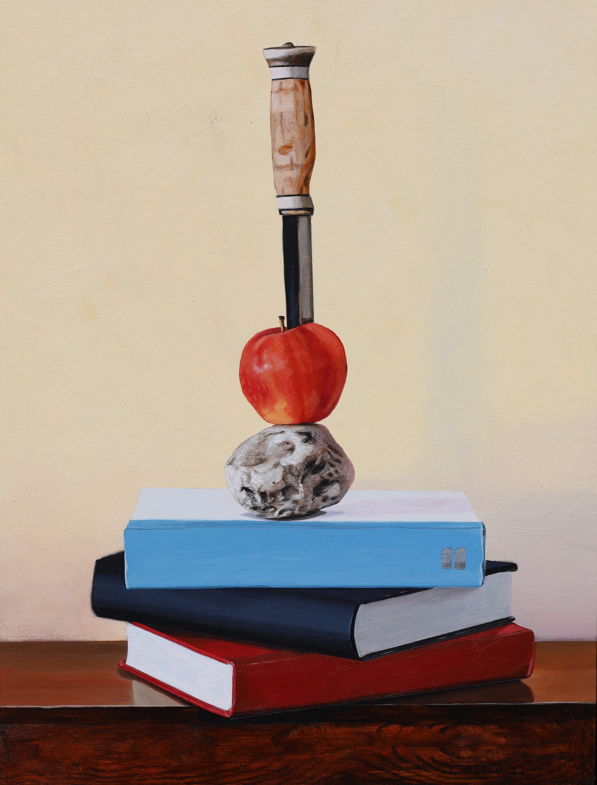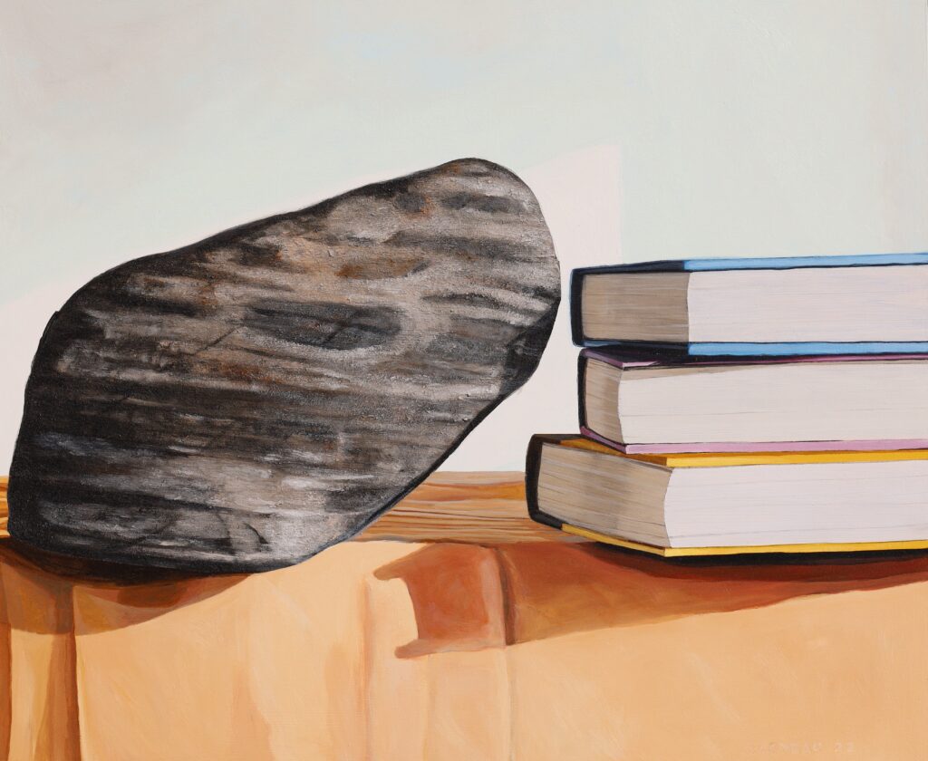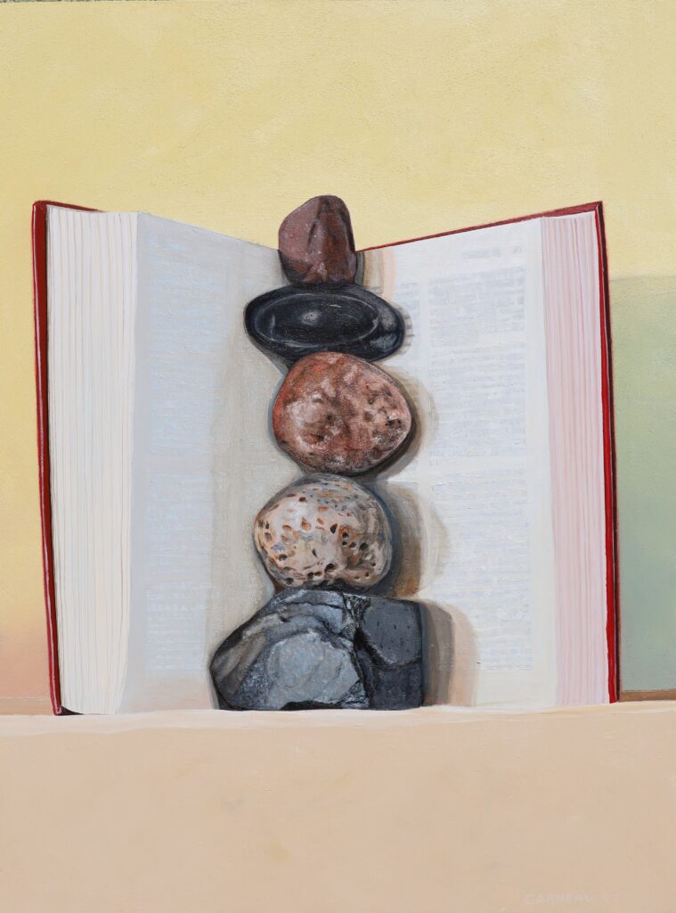 European Art Academies positioned still life painting at the bottom of their hierarchy. Being the depiction of the things of everyday life, still life was considered a poor container for the lofty concepts found in history, portraiture, and even landscape painting. Dark Chapters challenges this assumption and status. These realistic paintings consist of things that are ready to hand: rocks, stones, bricks, books, flowers, water, hammers, mirrors, fabric, flags, honey, fish, teacups, jars, boxes, string, rope, and chains. And some less homey items: skulls, bones, smoke, ancient stone tools, sashes, bees, flies, rotting fruit, and hand cuffs. The objects are arranged to suggest meanings beyond representation. Books, for example, stand for book knowledge, universities, and professors. Rocks represent Indigenous ways of knowing, being, and doing, and, sometimes, Indigenous persons. Some rocks are stones or Grandfathers.
