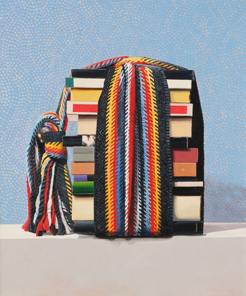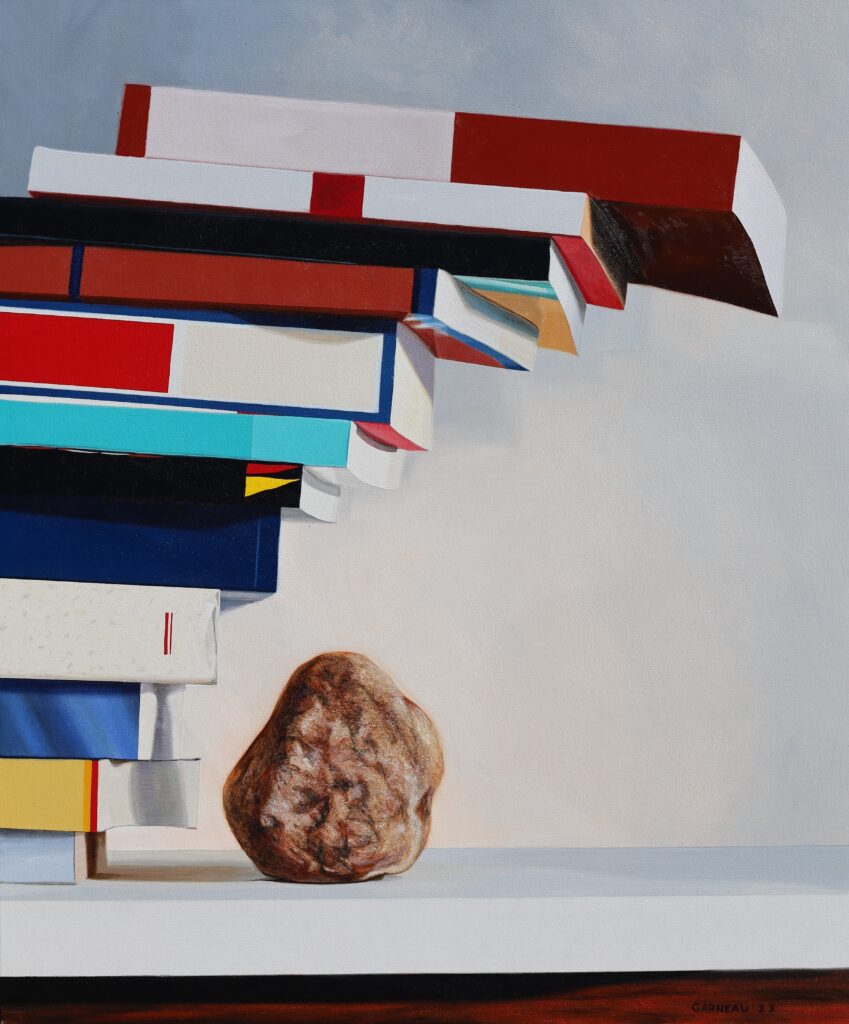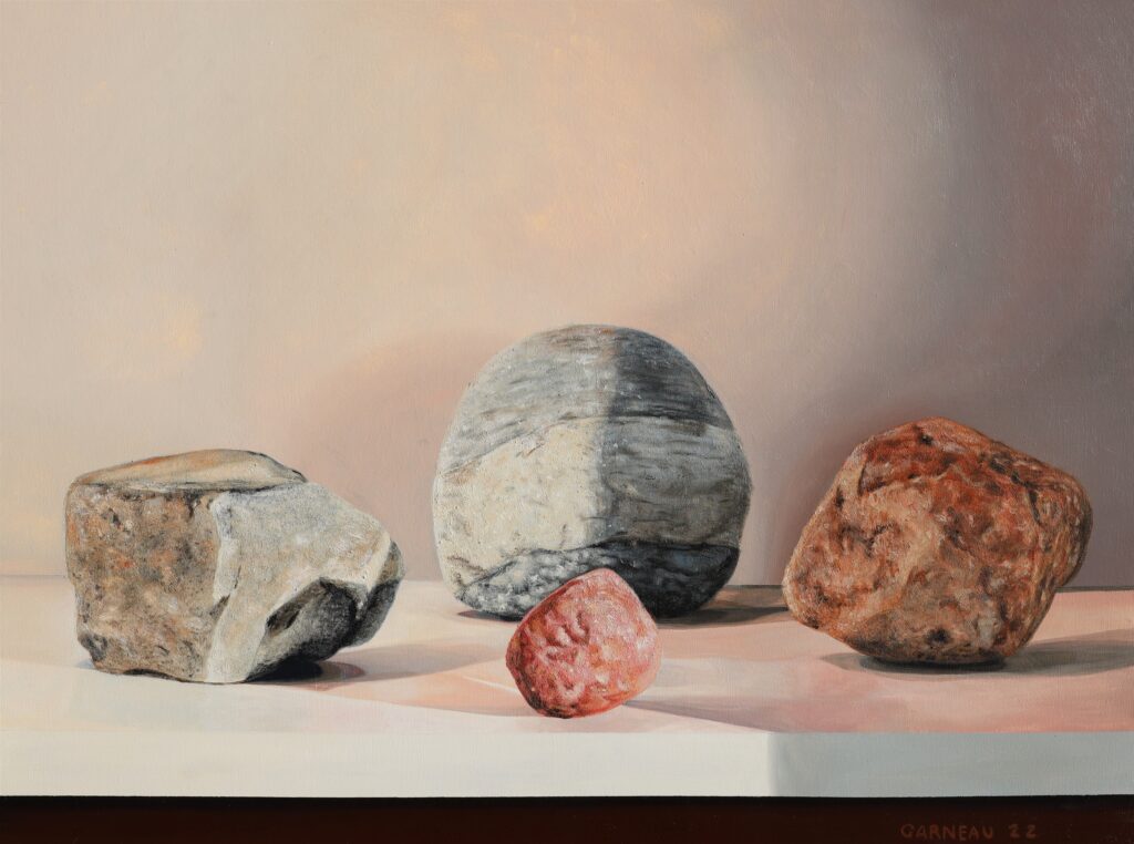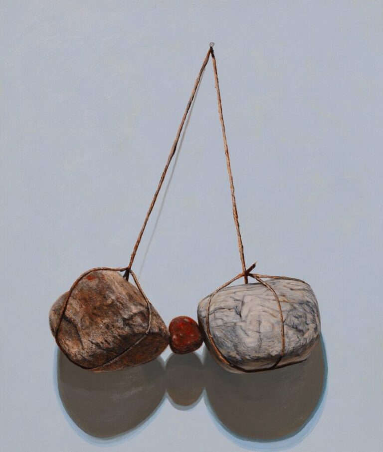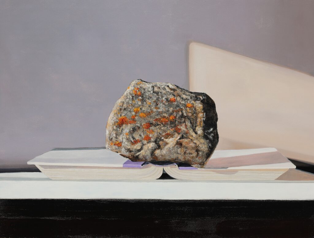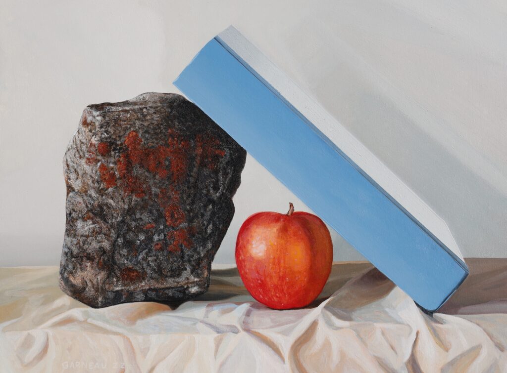 European Art Academies positioned still life painting at the bottom of their hierarchy. Being the depiction of the things of everyday life, still life was considered a poor container for the lofty concepts found in history, portraiture, and even landscape painting. Dark Chapters challenges this assumption and status. These realistic paintings consist of things that are ready to hand: rocks, stones, bricks, books, flowers, water, hammers, mirrors, fabric, flags, honey, fish, teacups, jars, boxes, string, rope, and chains. And some less homey items: skulls, bones, smoke, ancient stone tools, sashes, bees, flies, rotting fruit, and hand cuffs. The objects are arranged to suggest meanings beyond representation. Books, for example, stand for book knowledge, universities, and professors. Rocks represent Indigenous ways of knowing, being, and doing, and, sometimes, Indigenous persons. Some rocks are stones or Grandfathers.