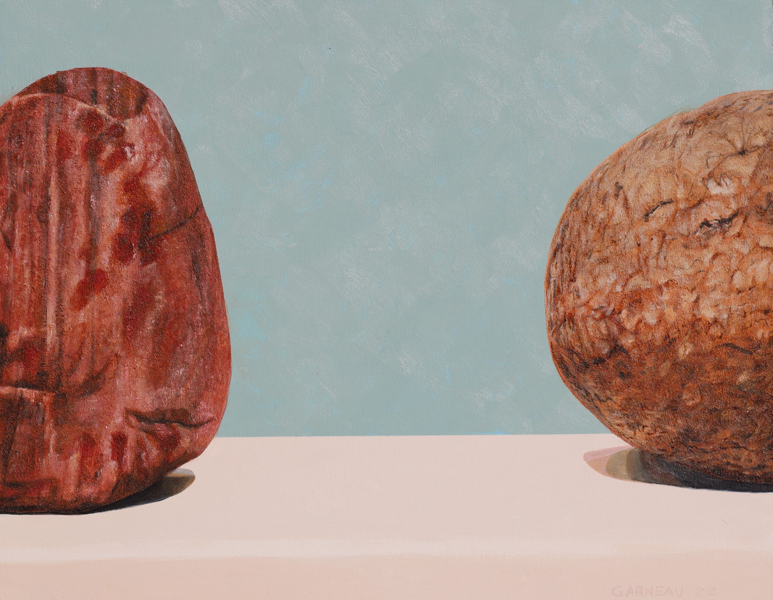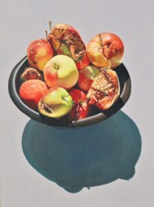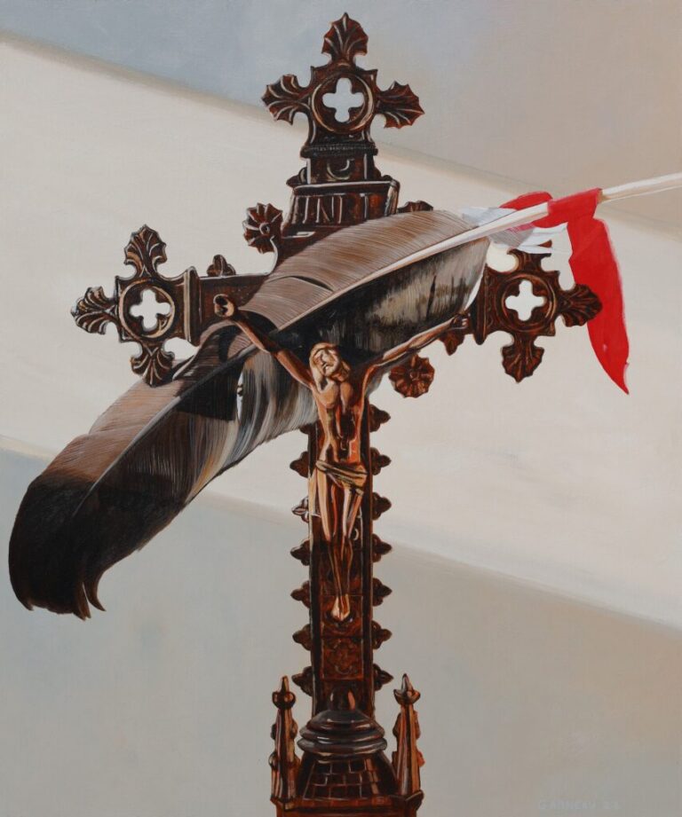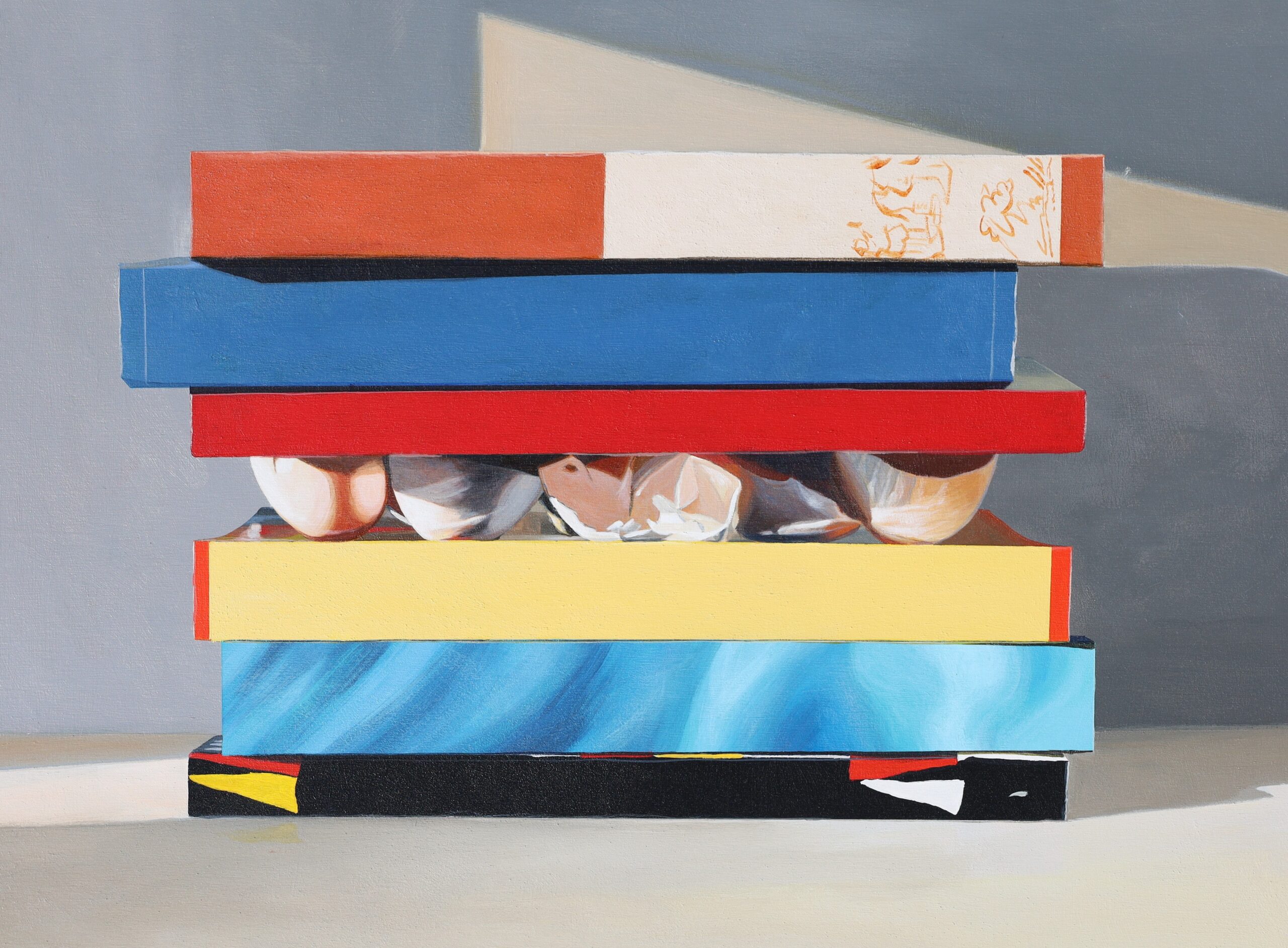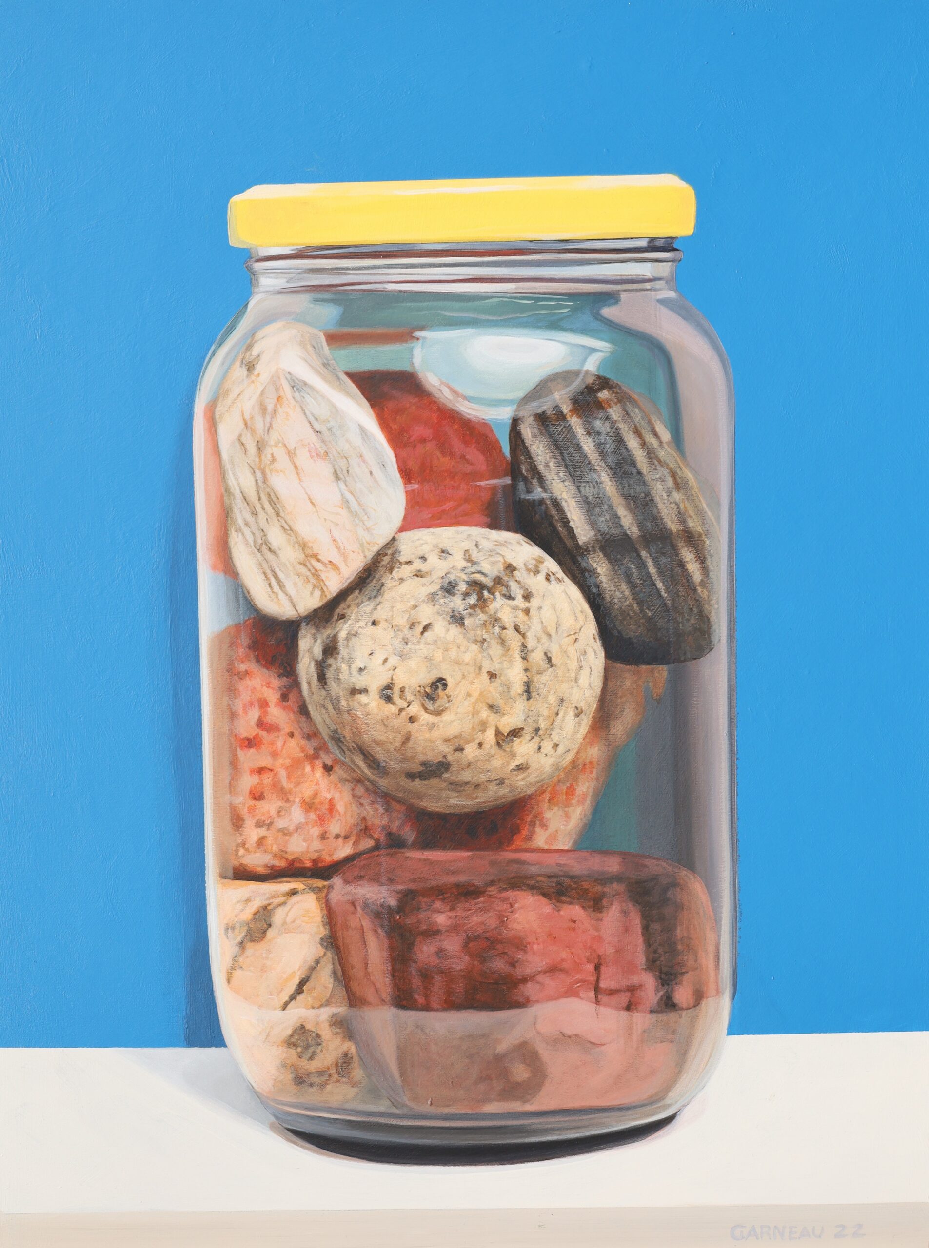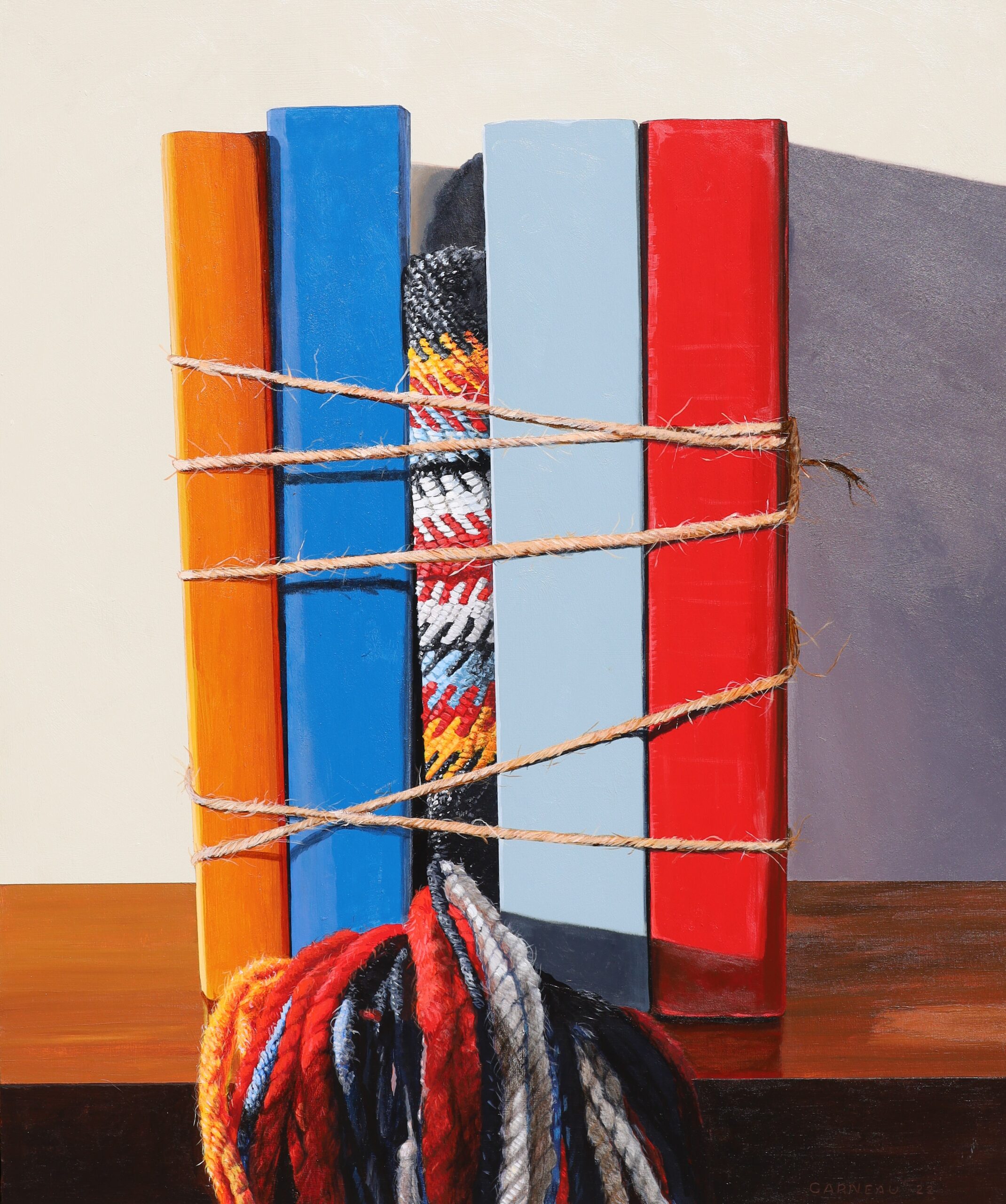 European Art Academies positioned still life painting at the bottom of their hierarchy. Being the depiction of the things of everyday life, still life was considered a poor container for the lofty concepts found in history, portraiture, and even landscape painting. Dark Chapters challenges this assumption and status. These realistic paintings consist of things that are ready to hand: rocks, stones, bricks, books, flowers, water, hammers, mirrors, fabric, flags, honey, fish, teacups, jars, boxes, string, rope, and chains. And some less homey items: skulls, bones, smoke, ancient stone tools, sashes, bees, flies, rotting fruit, and hand cuffs. The objects are arranged to suggest meanings beyond representation. Books, for example, stand for book knowledge, universities, and professors. Rocks represent Indigenous ways of knowing, being, and doing, and, sometimes, Indigenous persons. Some rocks are stones or Grandfathers.