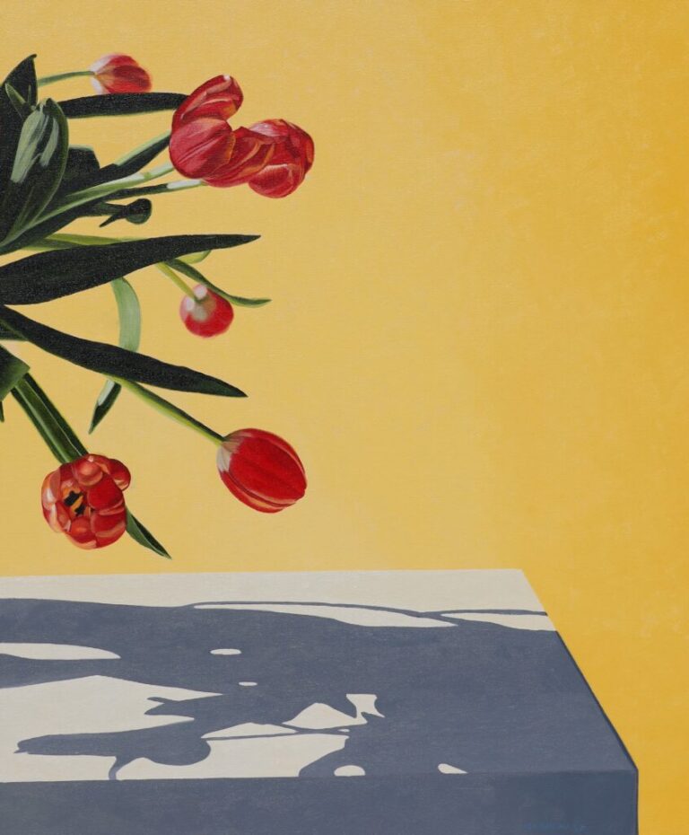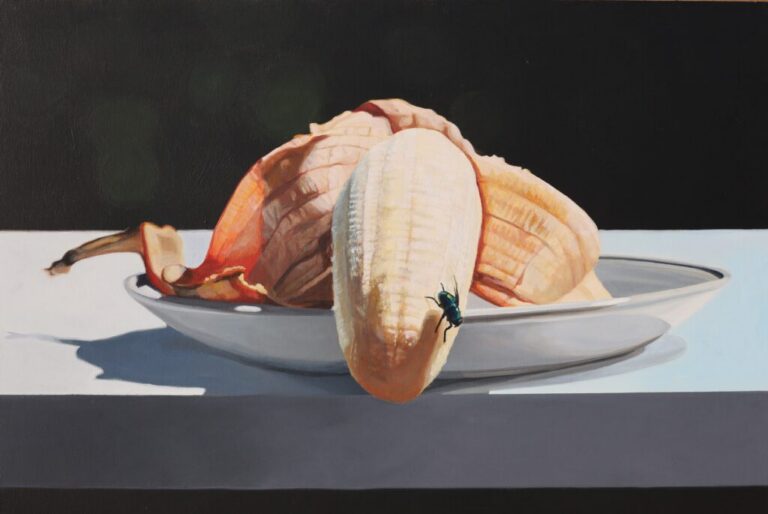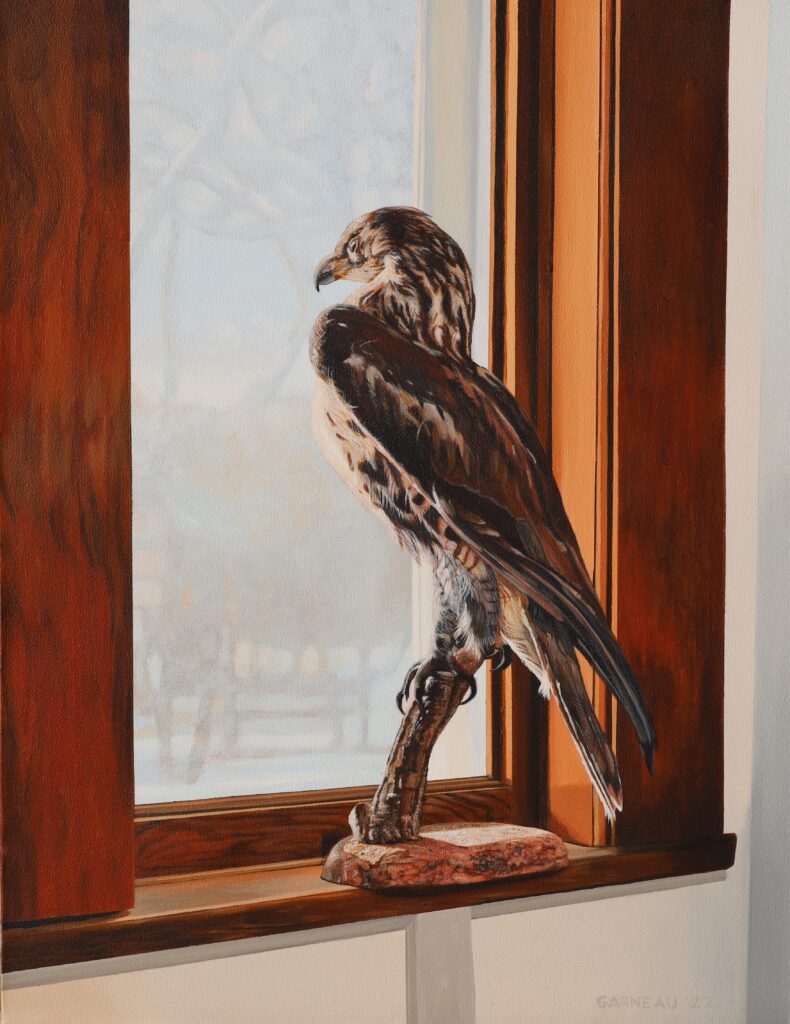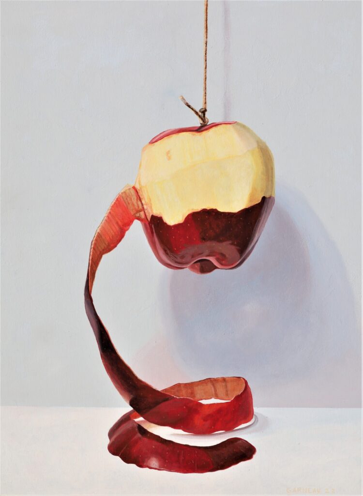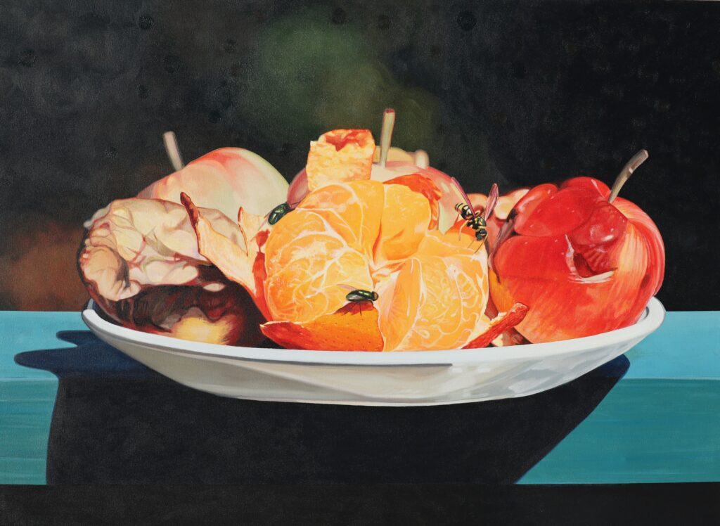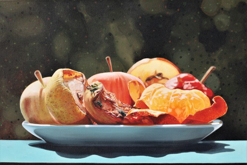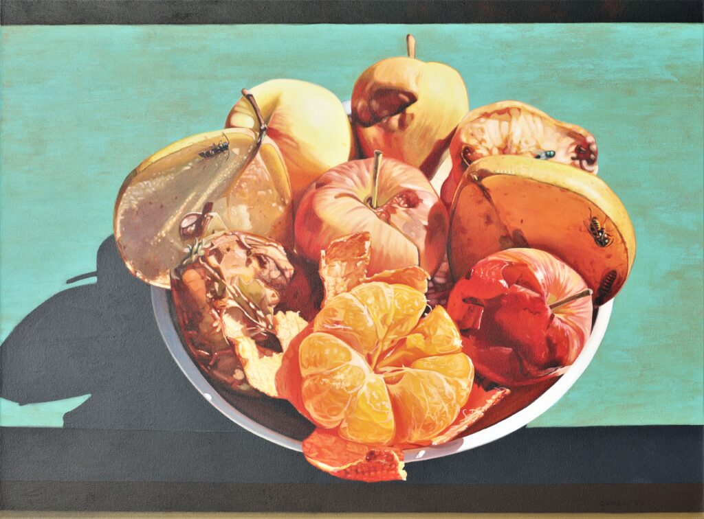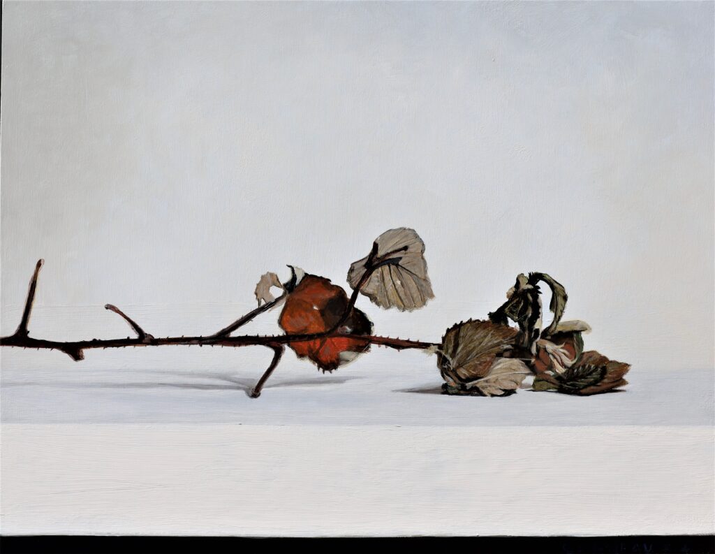 European Art Academies positioned still life painting at the bottom of their hierarchy. Being the depiction of the things of everyday life, still life was considered a poor container for the lofty concepts found in history, portraiture, and even landscape painting. Dark Chapters challenges this assumption and status. These realistic paintings consist of things that are ready to hand: rocks, stones, bricks, books, flowers, water, hammers, mirrors, fabric, flags, honey, fish, teacups, jars, boxes, string, rope, and chains. And some less homey items: skulls, bones, smoke, ancient stone tools, sashes, bees, flies, rotting fruit, and hand cuffs. The objects are arranged to suggest meanings beyond representation. Books, for example, stand for book knowledge, universities, and professors. Rocks represent Indigenous ways of knowing, being, and doing, and, sometimes, Indigenous persons. Some rocks are stones or Grandfathers.